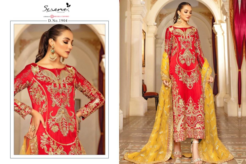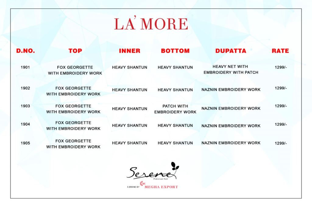 Serene La' More Designer Pakistani Style Salwar Kameez, this catalog top fabric is Fox Georgette heavy embroidered and this catalog bottom fabric is Heavy Santoon silk with a patch and catalog dupatta fabric is Nazneen/ Net heavy embroidered with Pakistani semi-stitched suits heavy embroidery on faux georgette concepts stylish look and beautiful designs.