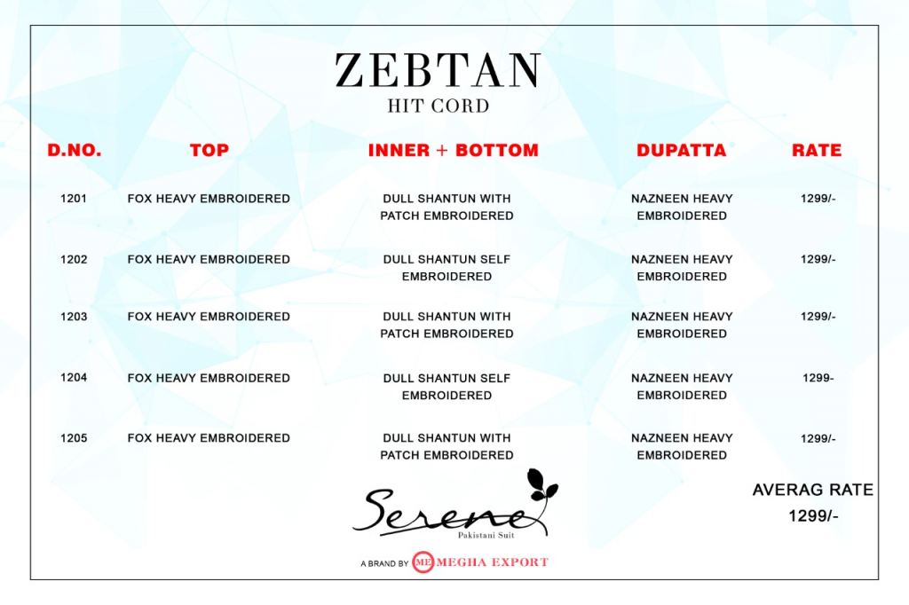 Serene presents Zebtan Hit Cord Pakistani Suits Collection, this catalog top is Foxe heavy embroidery work and the bottom is dull shantun with patch embroidery work dupatta is nazneen heavy embroidery work and this catalog design are with color combinations and designs are different.