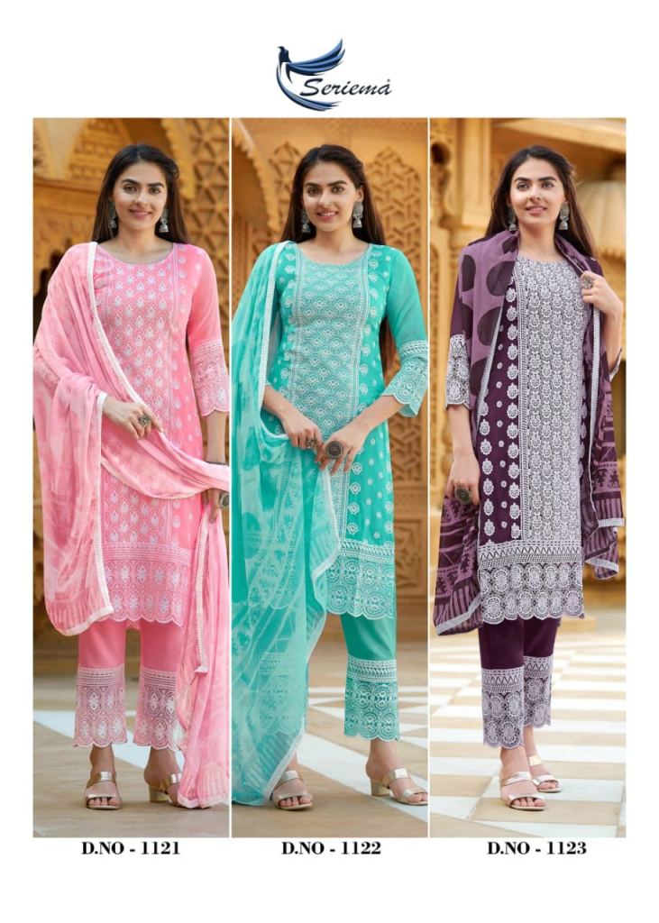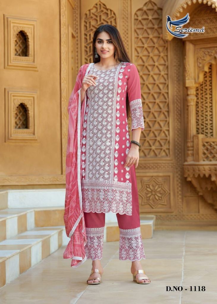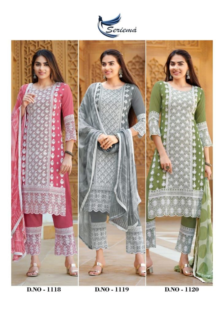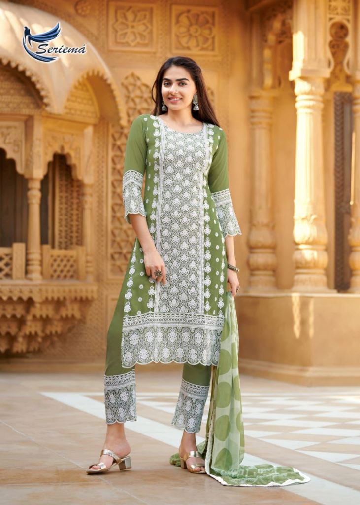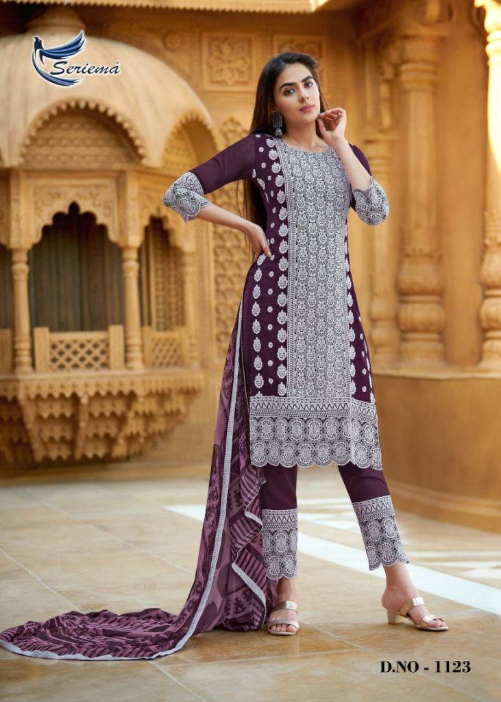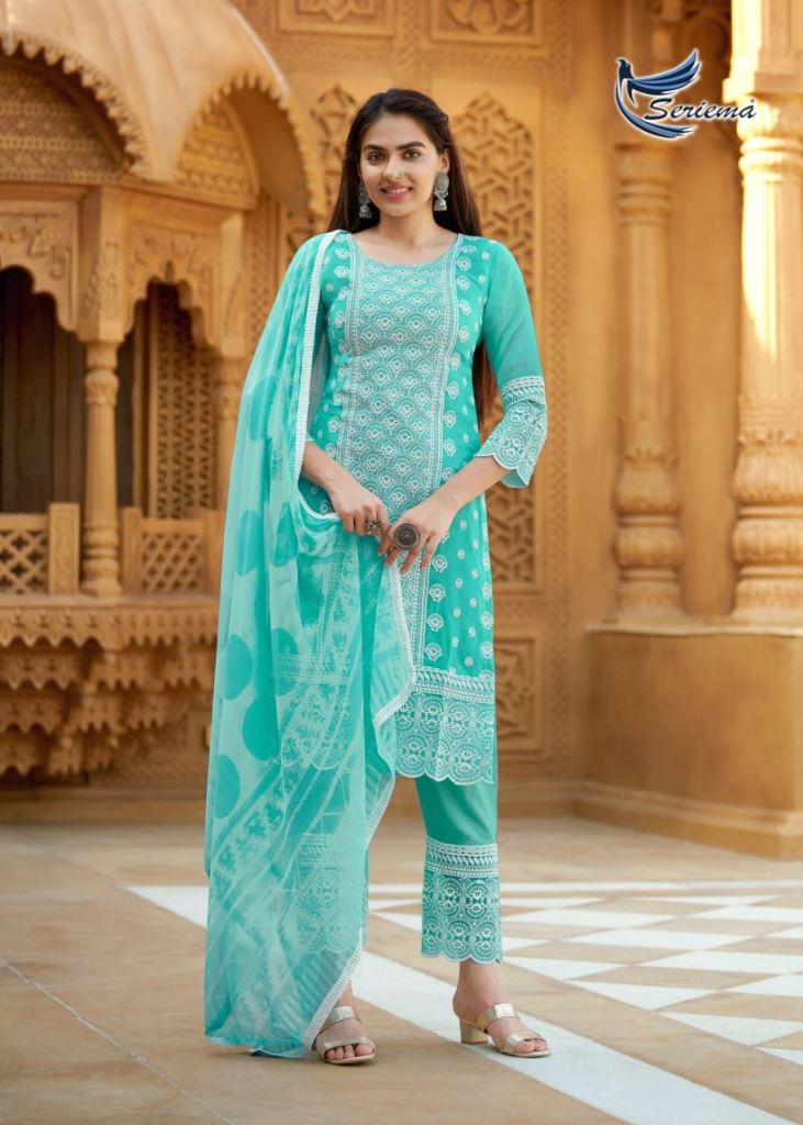 Seriema Kumb Destiny Designer Ready Made Collection, this catalogue fabric is fox georgette with heavy schiffli work and sleeves work and bottom fabric is crepe and heavy payal work with inner crepe and dupatta fabric is chiffon digital print with 4 said crochet lace also.