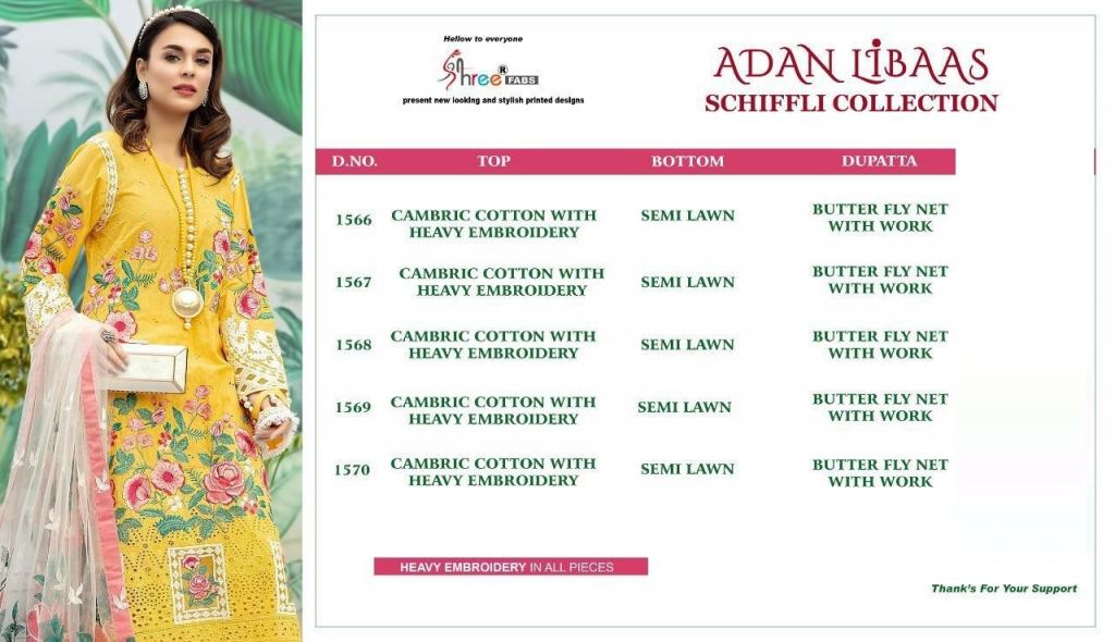 Shree Launching Adan Libaas Schiffli Collection Pakistani Salwar Suits, this catalog fabric is cambric cotton with heavy self embroidery and the bottom is semi lawn and dupatta is Butterfly net embroidery and