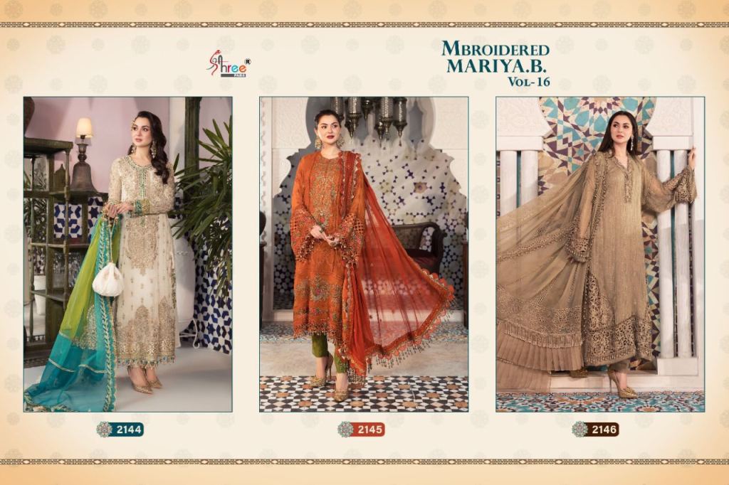 Shree Mbroidered Mariya B Vol 16 Catalog Designer Pakistani Georgette Embroidery Salwar Kameez. This catalog top fabric is faux georgette with heavy embroidery, the bottom fabric is semi lawn and the dupatta fabric is net embroidered.