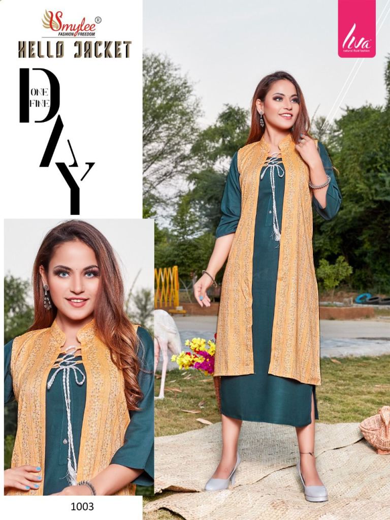 Smylee Hello Jacket Designer Kurti With Jacket Collection, this catalog fabric is HEAVY 14KG LIVA APPROVED PLAIN RIYON JACKET HEAVY FOIL PRINT LUREX RAYON and fancy jacket.