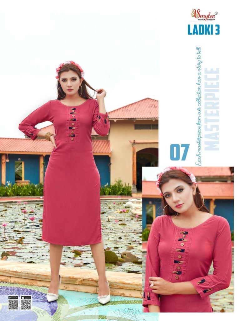 Smylee Laadki vol 3 Ethnic Wear Rayon Designer Kurti catalog, this catalog fabric is Rayon and this catalog design is different with fancy nack work also.
