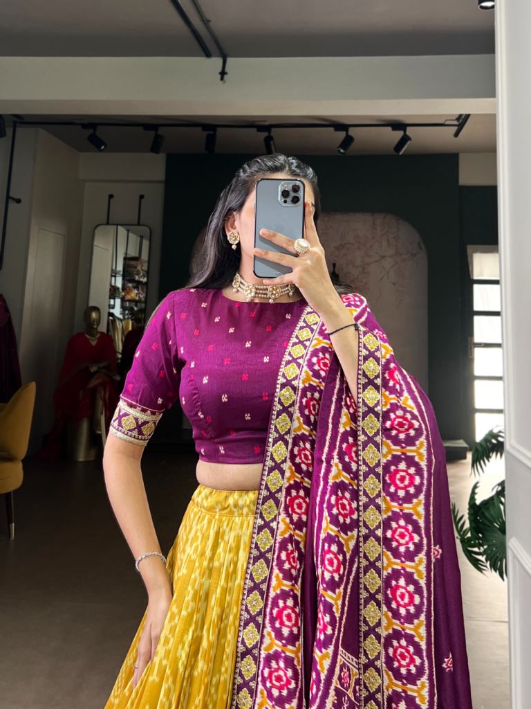 Fabric Description : Lehenga (Stitched) Fabric : Tasar Silk | Lehenga Work : Ikkat Print | Lehenga Waist : SUPPORTED UP TO 42 | Lehenga Stitching : Stitch With Canvas And Can Can | Lehenga Closer : Drawstring With Zip | Length : 41 | Flair : 3.50 Meter | Inner : Micro Crepe | Blouse (Unstitched) Fabric : Tasar Silk | Blouse Work : Printed With Sequins and Thread Embroidery Lace Touch Up | Blouse Length : 0.80 Meter | Dupatta Fabric : Tasar Silk | Dupatta Fabric : Tasar Silk Dupatta work : Ikkat Print With Sequins and Thread Embroidery Lace Border | Dupatta Length : 2.40 Meter