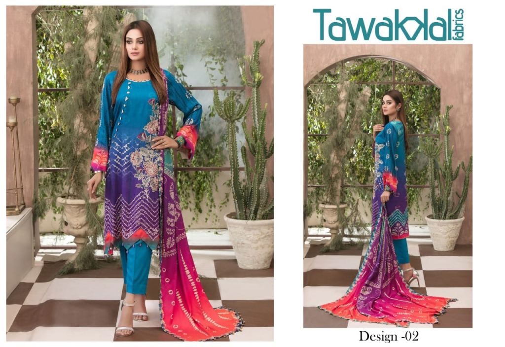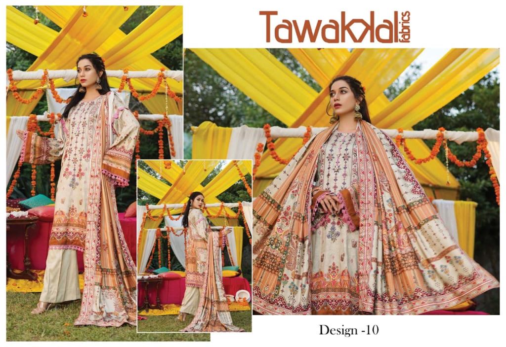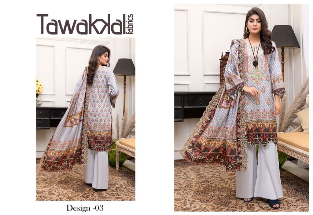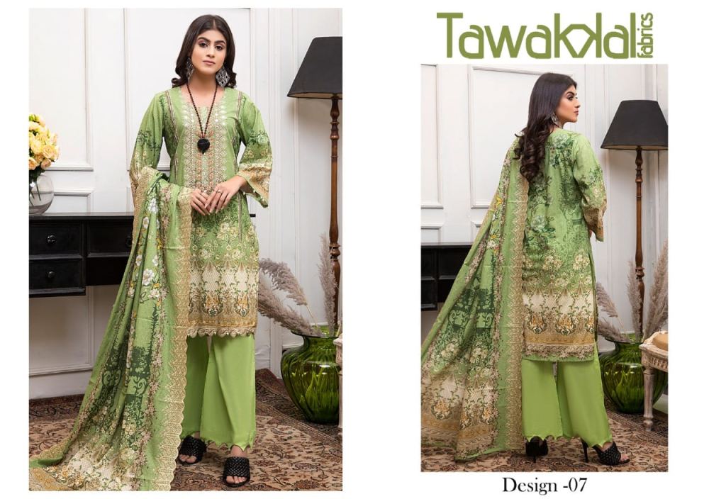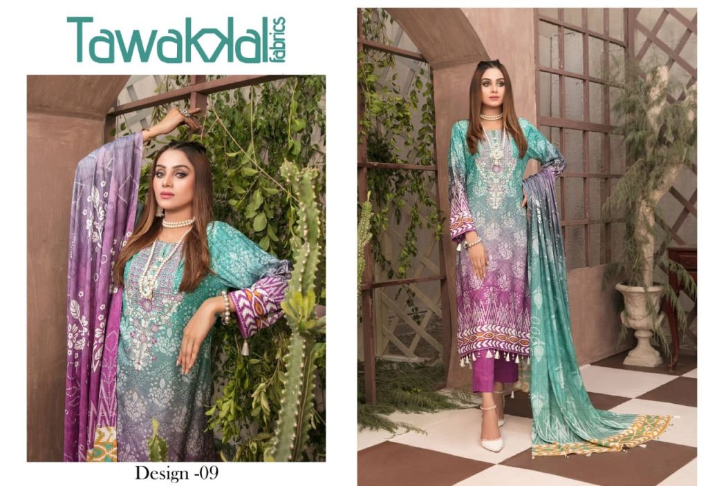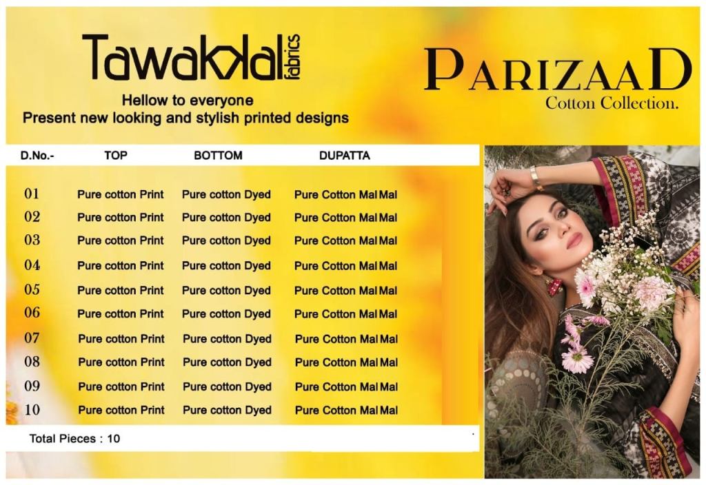 Tawakkal Parizaad Catalog Daily Wear Karachi Cotton Dress Materials. in this catalog top fabric is pure cotton printed, the bottom fabric is pure cotton dyed and the dupatta fabric is cotton mal mal.