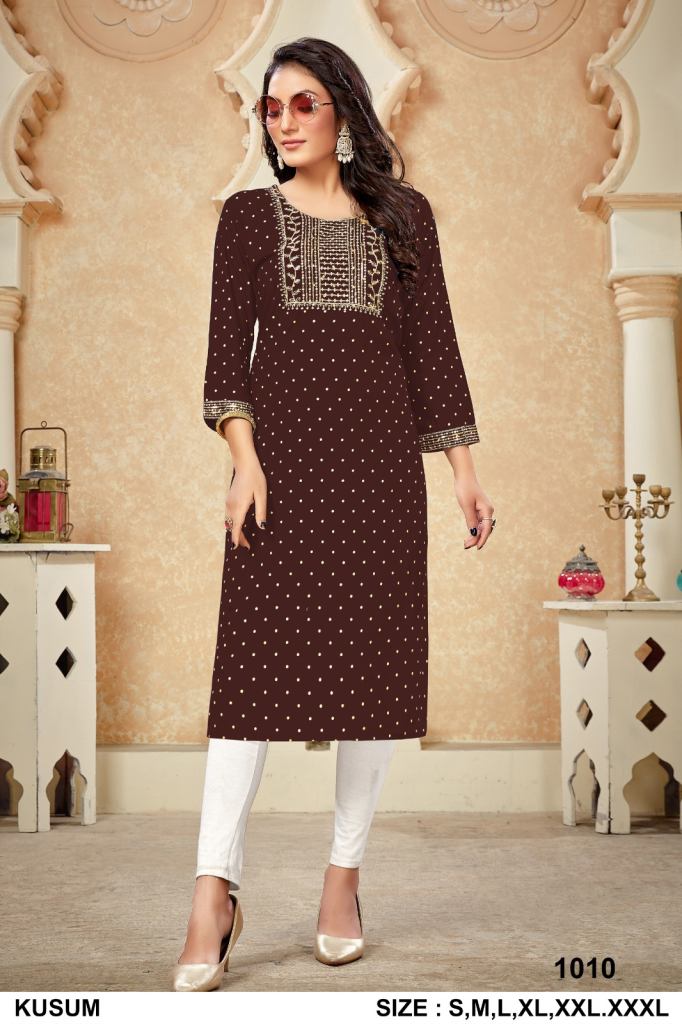 Watermelon Kusum Daily Wear Rayon Printed Kurti Collection. THIS CATALOGUE IS A TOP RAYON GOLD PRINT EMBROIDERY SEQUENCE WORK?LENGTH 42? 1 DESIGN 10 COLOURS.