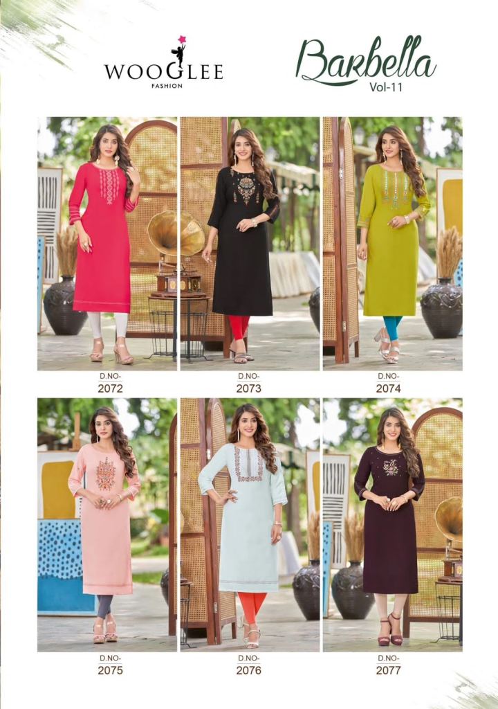 Shop Wooglee Barbella Vol 11 Heavy Rayon Embroidery Kurti Collection Available At Wholesale Rate