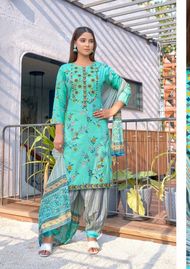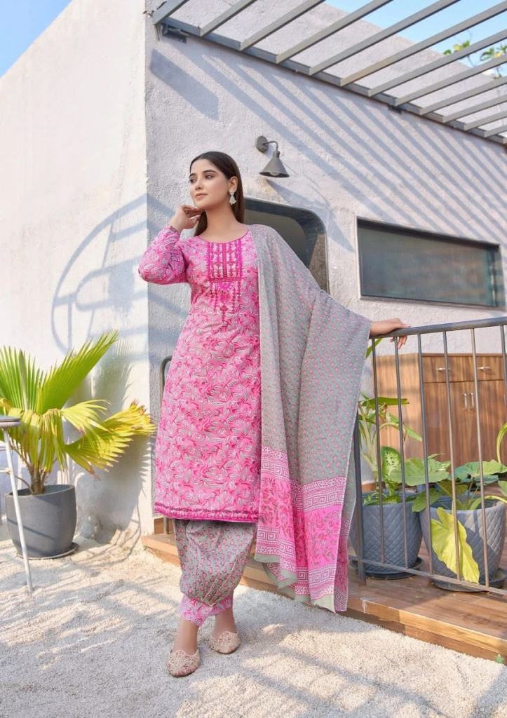 Top:- Pure Cotton Printed With Exclusive Neck And Daman Work (Cut:- 2.50 Mtr) | Bottom:- Pure Cotton Printed (Cut:- 2.50 Mtr) | Dupatta:- Cotton Printed Dupatta With Box Pallu Fancy Design (Cut:- 2.25 Mtr)