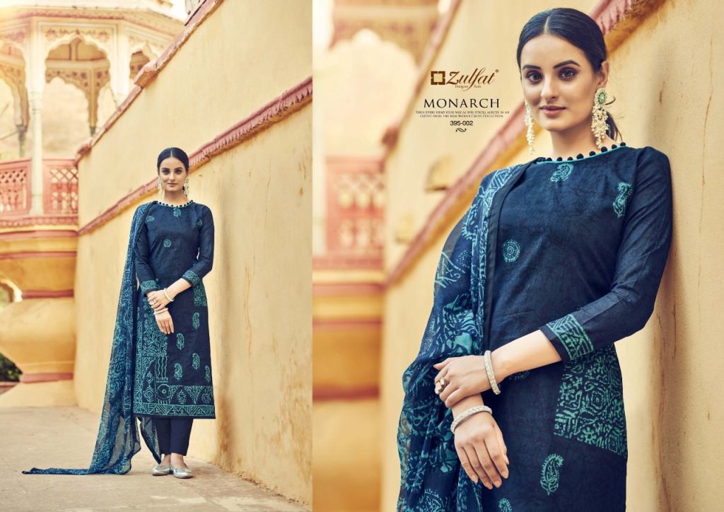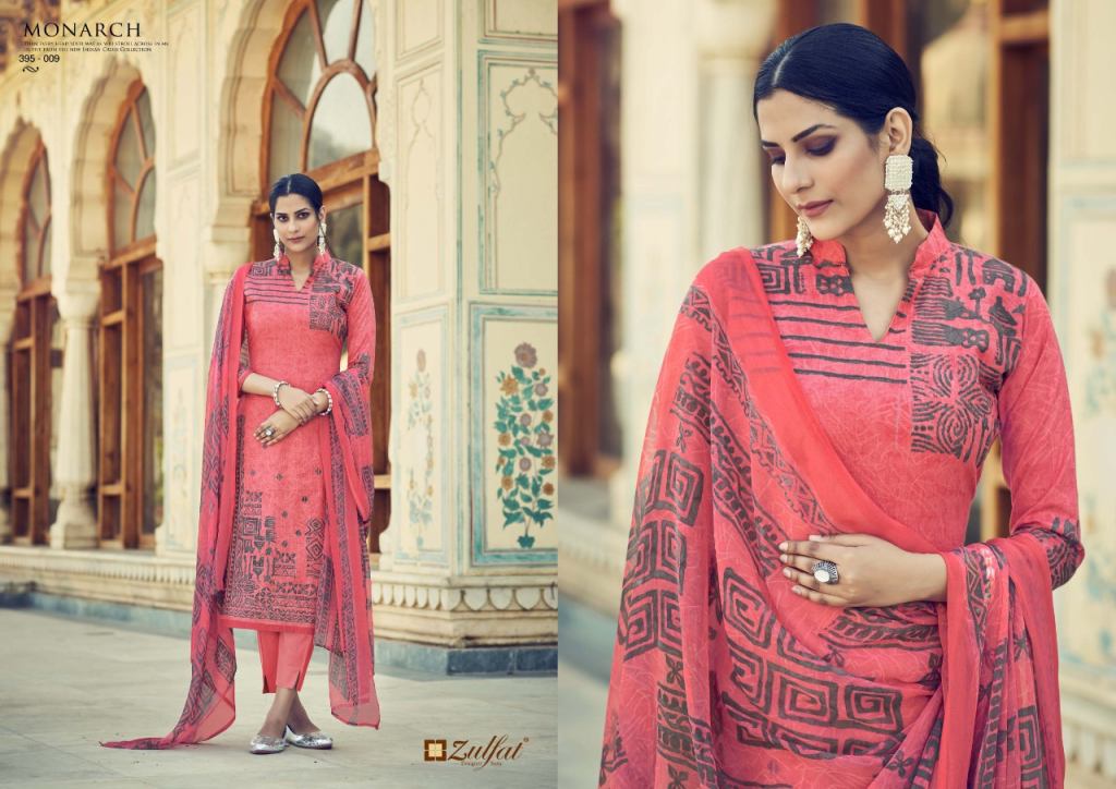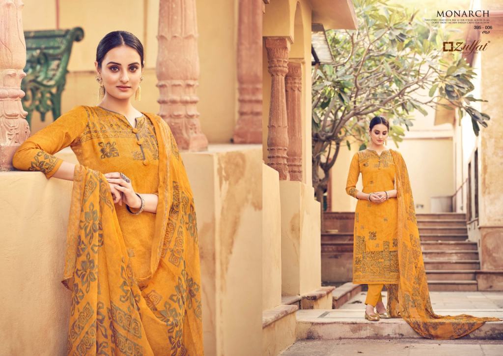 Zulfat Monarch Catalog Regular Wear Pure Cotton Ladies Dress Materials. In this catalog top fabric is 100% Pure Cotton Digital Style Print. (2.50 mtrs), Bottom fabric is pure cotton (3 mtr) and dupatta fabric is pure nazneen chiffon printed.