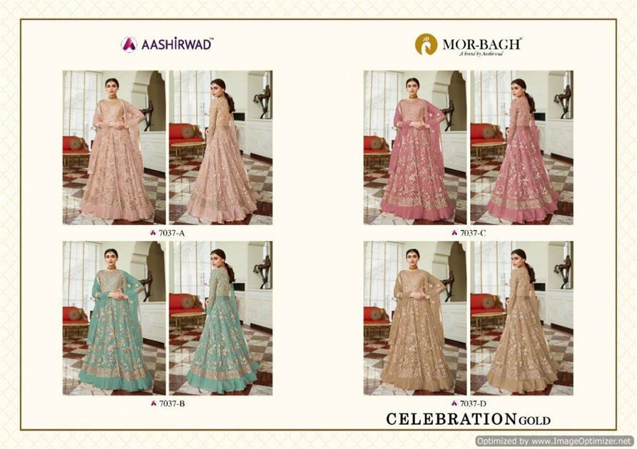 Aashirwad by Celebration Gold Wedding Dress Collection. this catalog is the texture in the Heavy butterfly net. this assortment is all out four various structures and hues. this collection is structured like a portion of the print and a portion of the normal example. this catalog is a top Heavy butterfly net front and back work with Satin inner and Anarkali style, bottom are net and dupatta are also net in fabric.