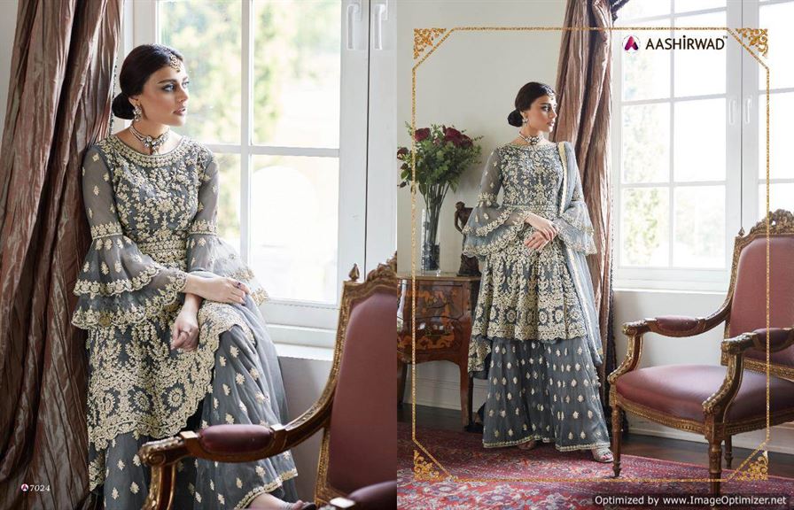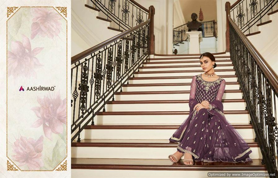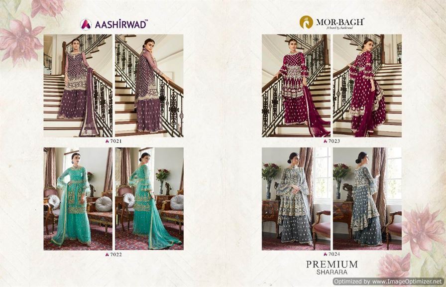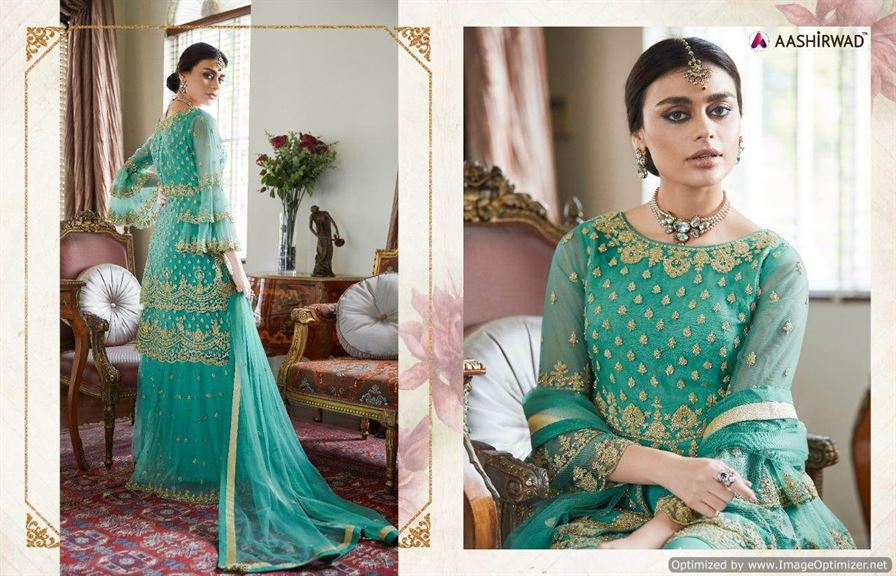 Aashirwad by Premium Sharara Designer Salwar Suits catalogue. this catalogue are fabric in Butterfly Net. this catalogue are total in four different designs and color. this catalogue are top heavy Embroidery work in full of the neck part and lowest part and sleeves are some of the little work, bottom are sarara types with some of the little work. dupatta are small butti like designs and that are very special and unique style.