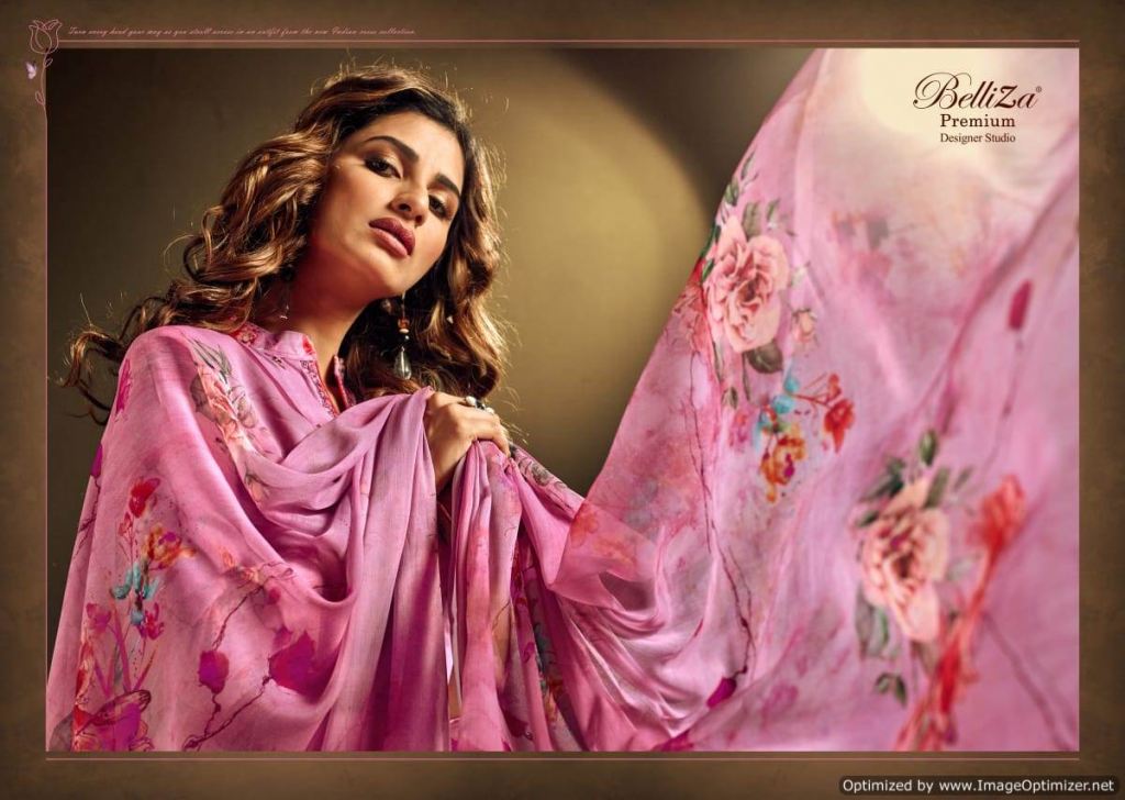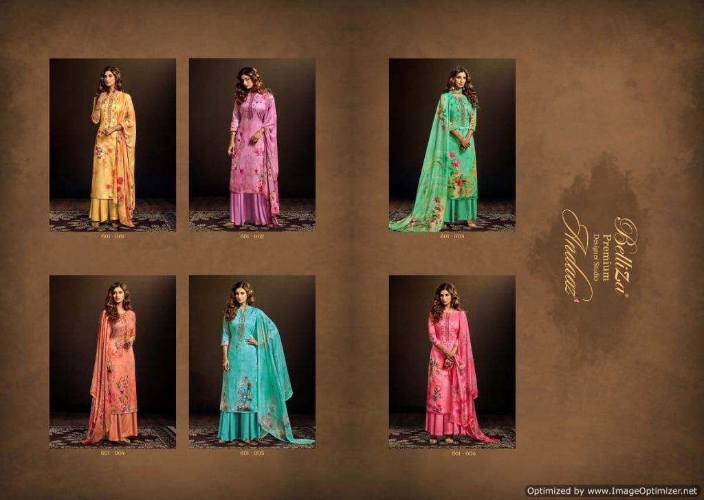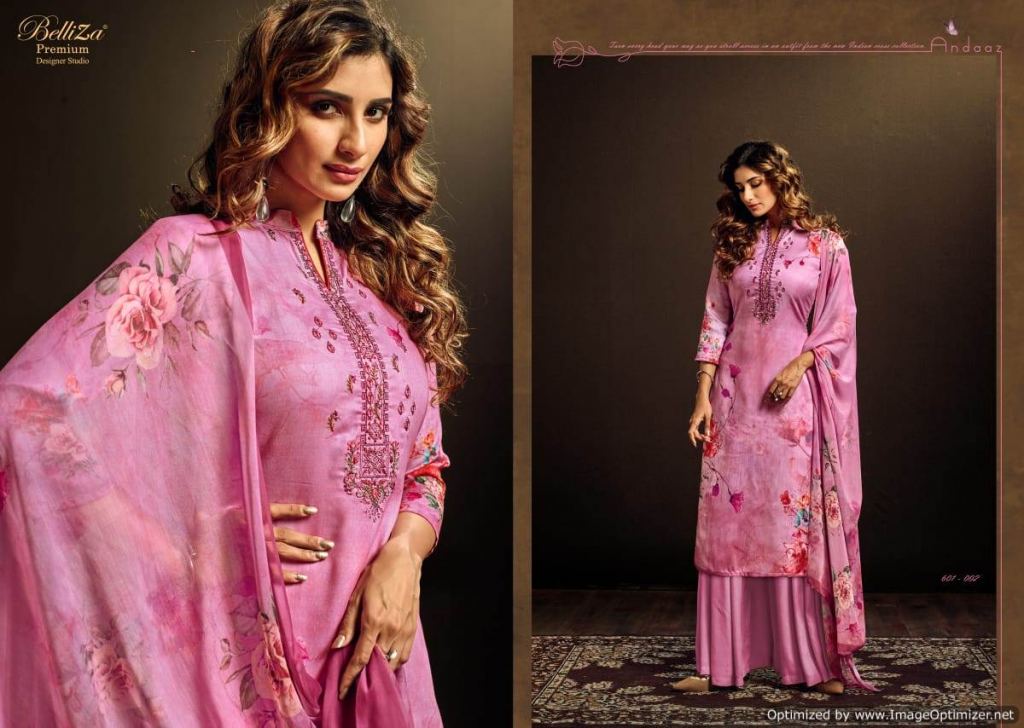 Belliza Present Andaaz Festive Wear Collection. This index is in the texture of Jam Cotton. this assortment is a sum of different six various Designs and shading. this list all are distinctive shading and designs too. this catalog is top Pure Heavy Jam Cotton Satin Original Digital Print with very fine Embroidery work. The bottom is pure cotton salwar, with dupatta is Pure Dupatta Bemberg Chiffon