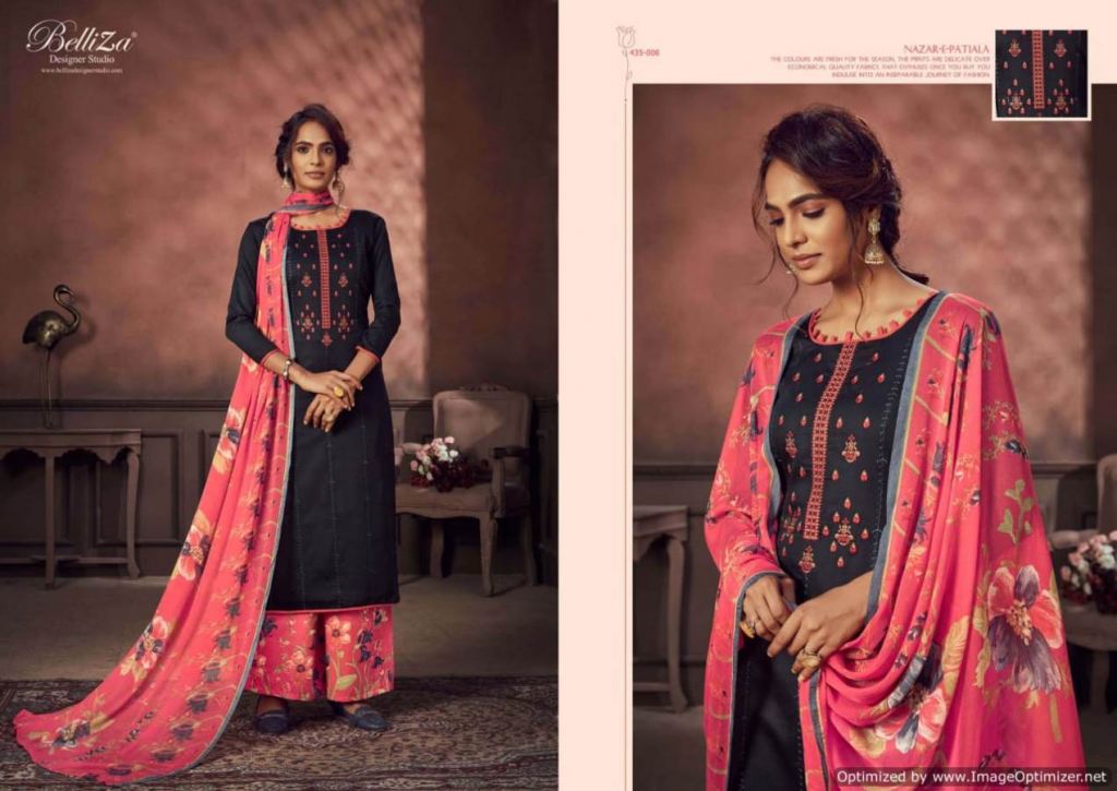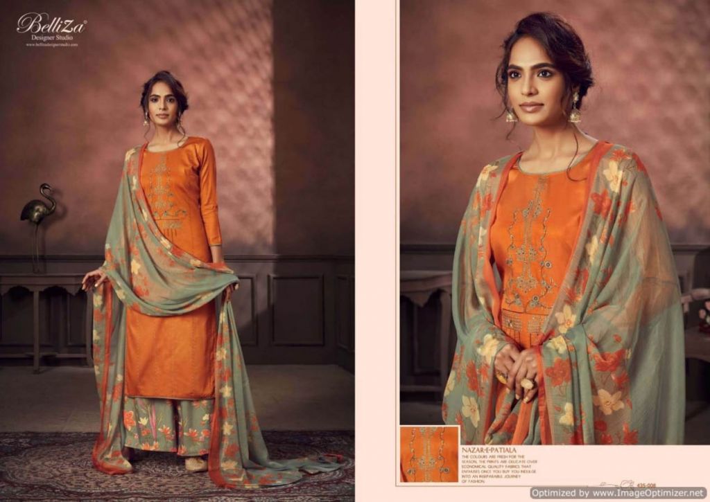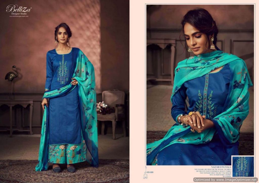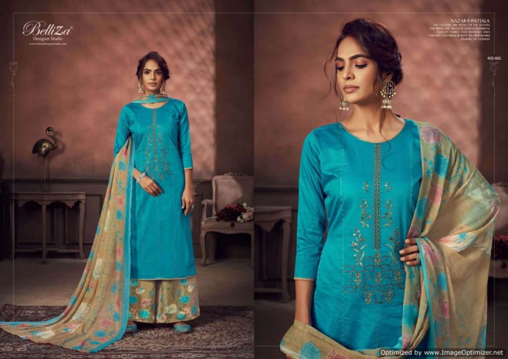Belliza Nazar E Patiala 3 collection of pure jam cotton dress materials with kashmiri embroidery work in different designs and colours. 2.50mtr pure jam cotton top with kashmiri embroidery work. 3.00mtr (apx) soft cotton printed salwar. 2.30mtr pure nazneen dupatta with 4-side lace. This catalogue is available at wholesale rate.