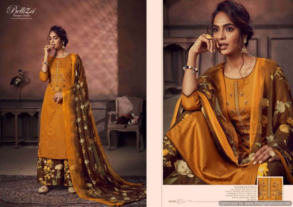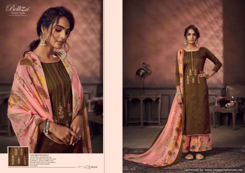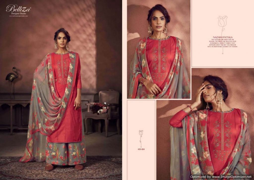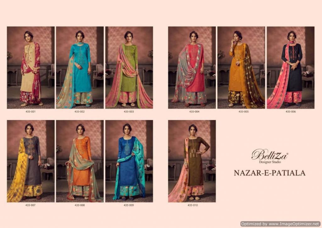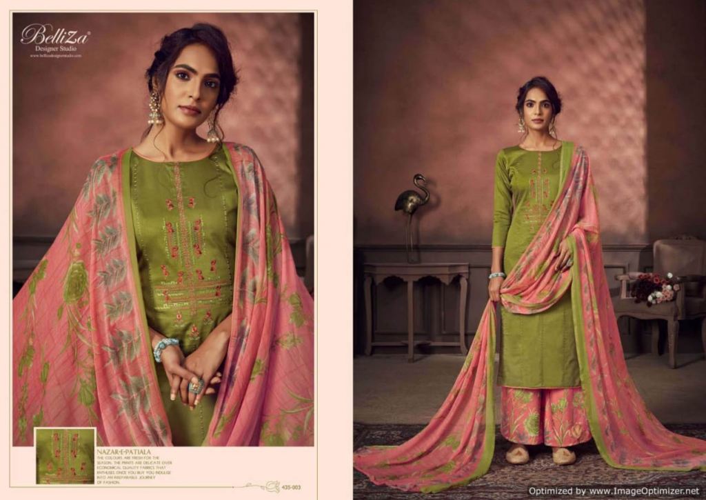 Belliza Nazar E Patiala 3 collection of pure jam cotton dress materials with kashmiri embroidery work in different designs and colours. 2.50mtr pure jam cotton top with kashmiri embroidery work. 3.00mtr (apx) soft cotton printed salwar. 2.30mtr pure nazneen dupatta with 4-side lace. This catalogue is available at wholesale rate.