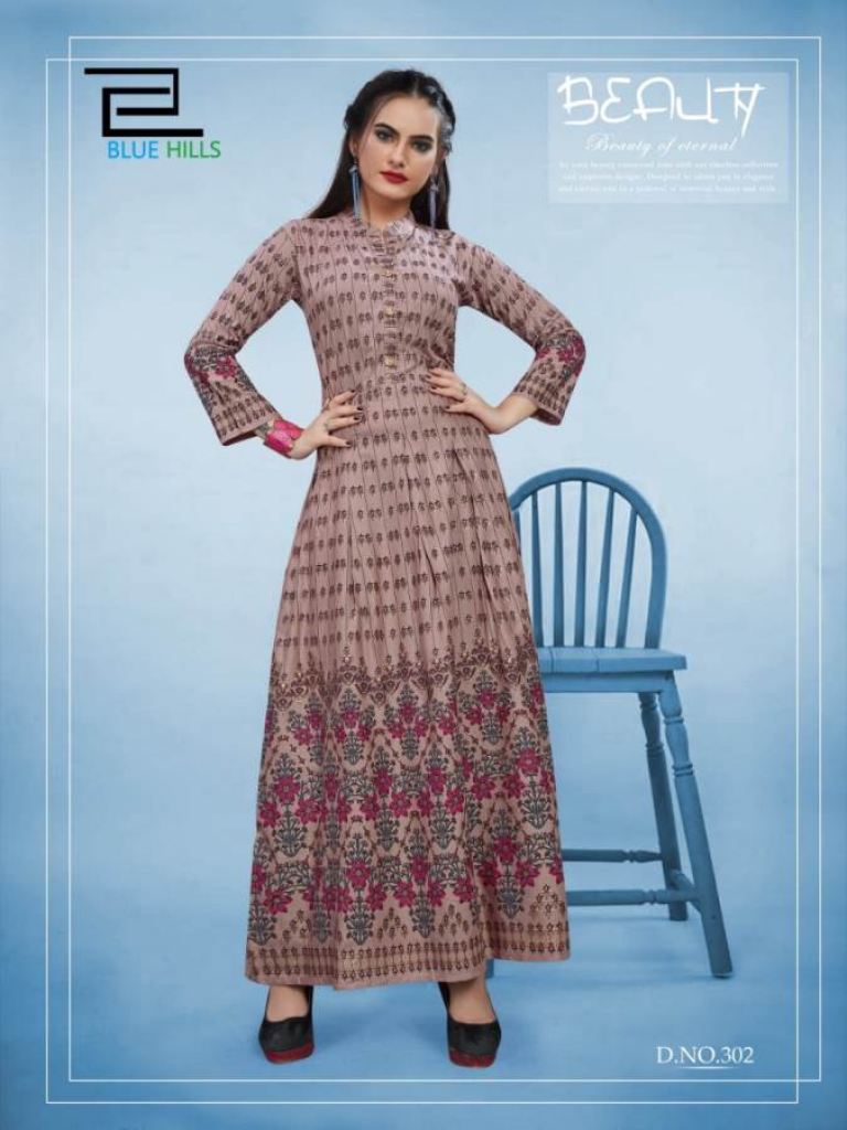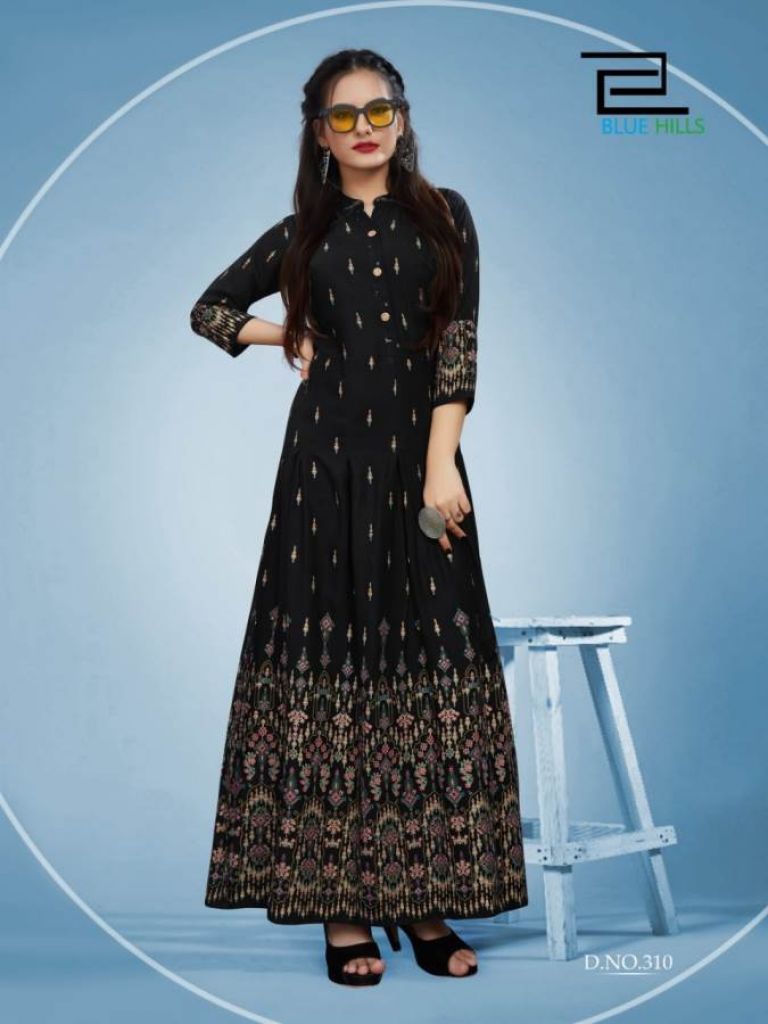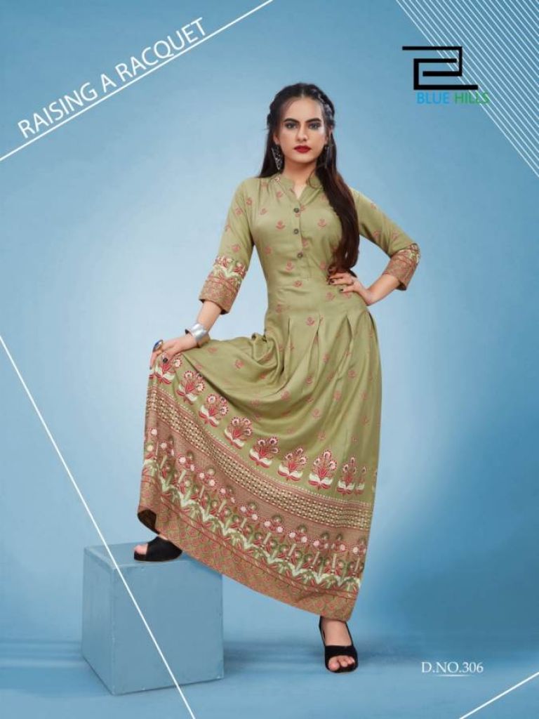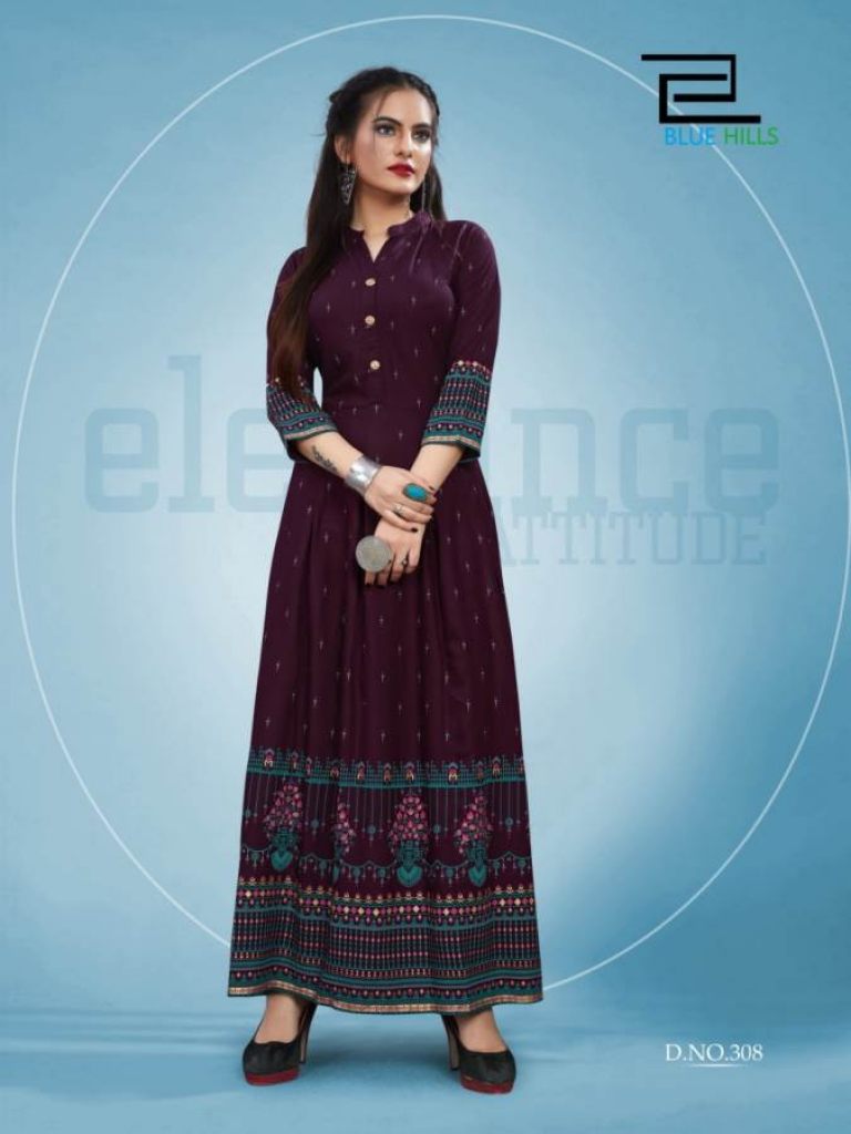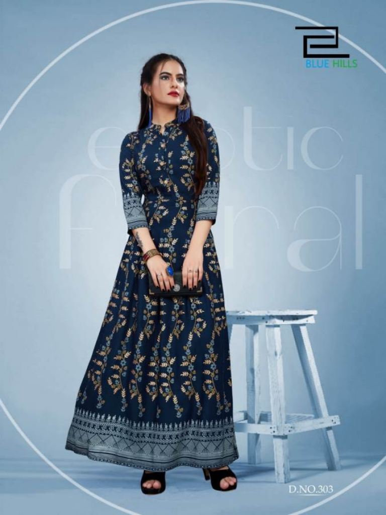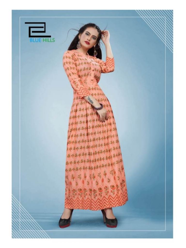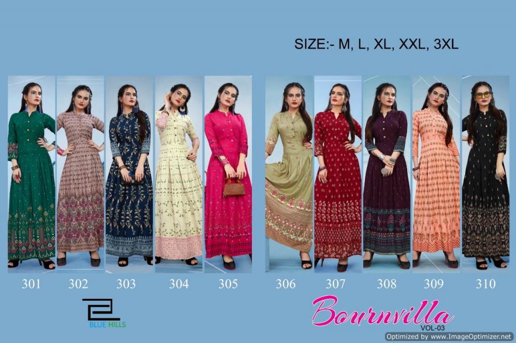Blue hills Bournvilla 3 collection of heavy rayon long gown type kurtis with different printed design in different colours. This catalogue is available at wholesale rate.