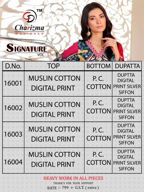 | NAME : | Charizma by Signature vol 1 Muslin Silk Cotton Pakistani Suits Collection |