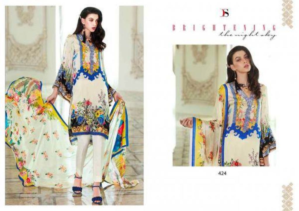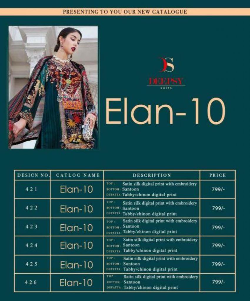 Deepsy Present Elan vol 10 Pakistani Suits collection. this catalogue is the texture in satin silk. this assortment is all out six various structures and hues. this collection is structured like a portion of the print and a portion of the normal example. this catalogue is top satin silk digital print with Embroidery work, the bottom is santoon with dupatta is tabby or Chinon digital print.