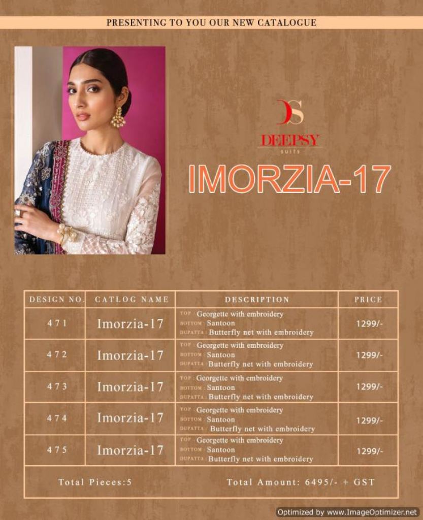 Deepsy Present Imorzia vol 17 Pakistani Salwar Suits collection. This index is in the texture of Georgette. this assortment is a sum of different Five various Designs and shading. this list all are distinctive shading and designs too. this catalogue is top georgette with Embroidery work, the bottom is santoon with dupatta is Butterfly net with Embroidery work.
