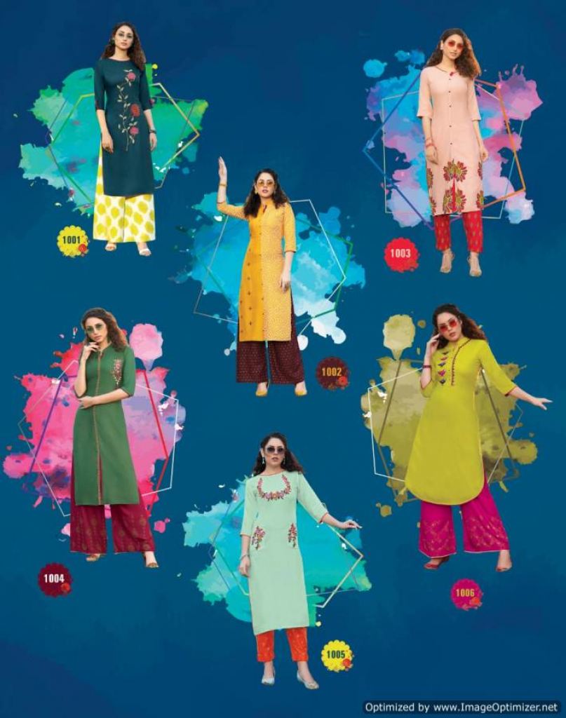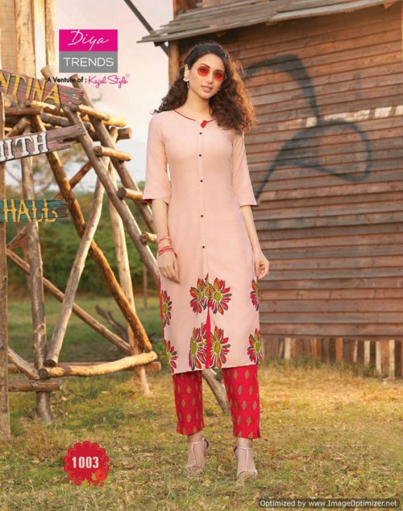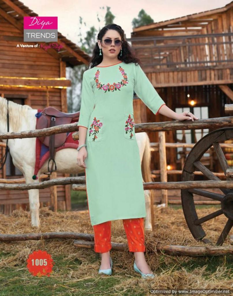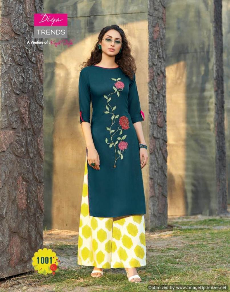 Diya Trends Present Fusion vol 1 Kurti With Bottom collection. This index is in the texture Rayon And Cotton . this assortment is a sum of different six various Designs and shading. this list all are distinctive shading and designs too. this catalog is Kurtis that are two fabric with Embroidery work that is neck part with and low part also some work with pant are also opposite color and other designs also.