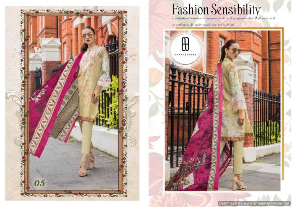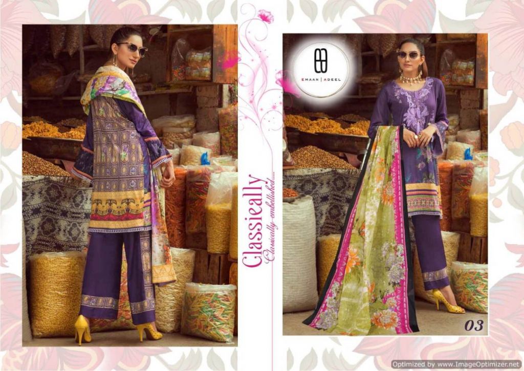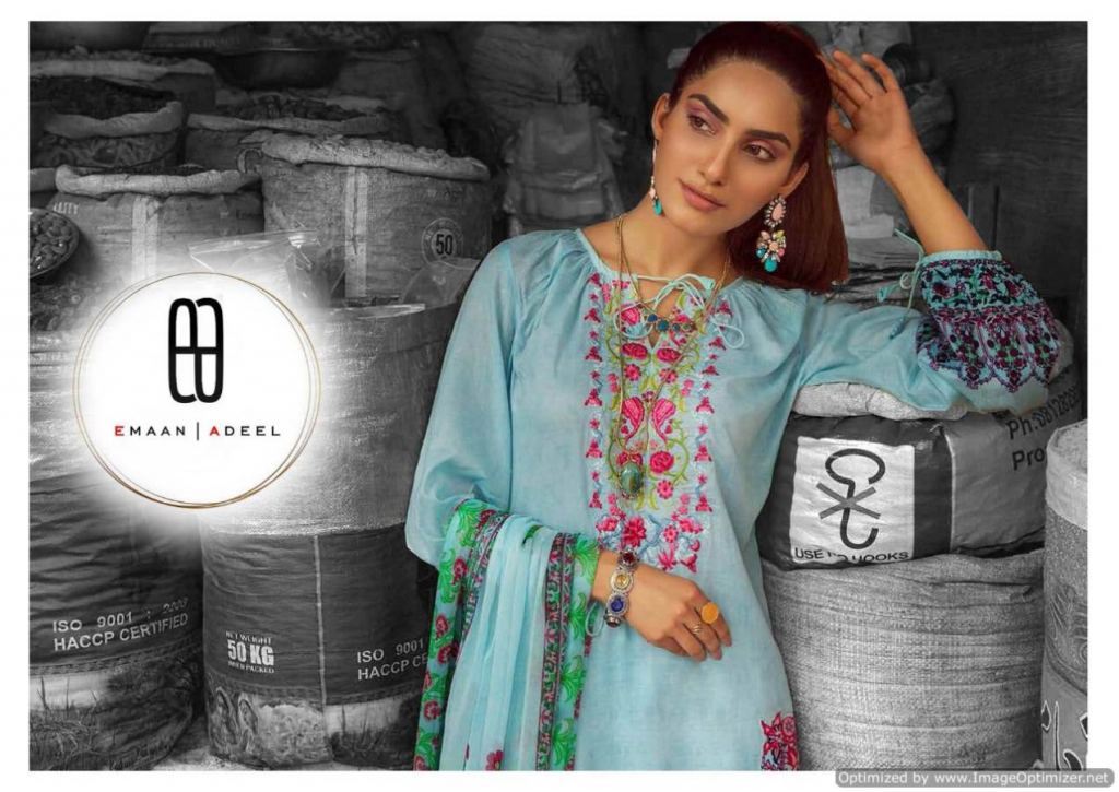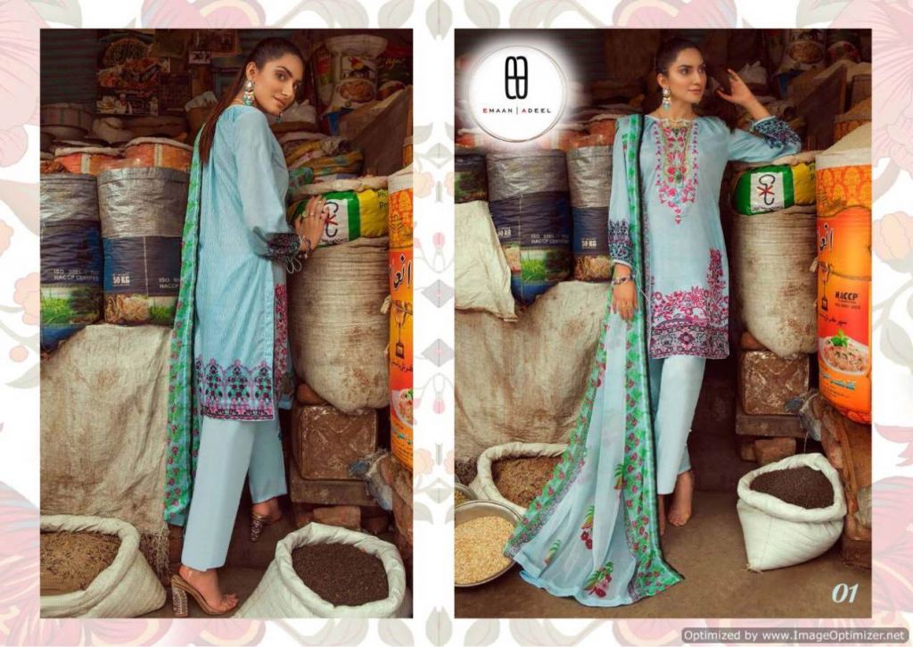 Emaan Adeel 1 collection of pure lawn cotton pakistani suits with different printed designs in different colours. Pure lawn cotton 2.25mtr top with 2.00mtr bottom and 2.25mtr dupatta. This catalogue is available at wholesale rate.