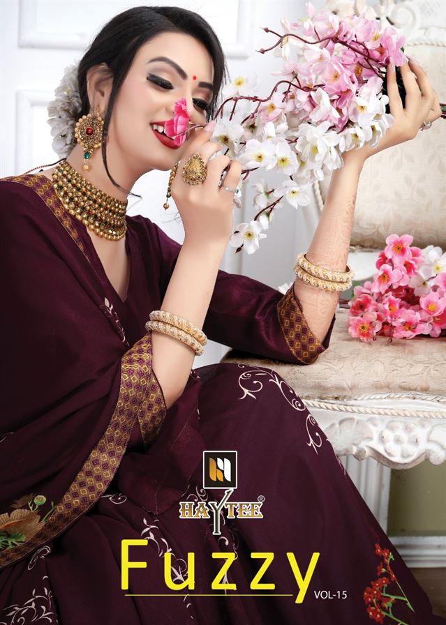 Haytee by Fuzzy vol 15 Sarees catalogue. this sarees are fabric in Heavy Dani Printed. this sarees are casual wear collection, and that are twelve in color and different designs. this catalogue are very fine designs and color combination. designs are modified and latest, blouse are same as a sarees color.
