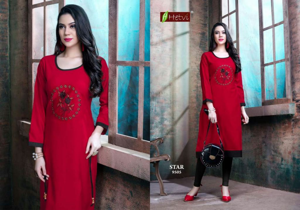Hetvi Present Star Kurtis Catalogue. This index is in the texture of Rayon Bombay fabric.. this assortment is a sum of different Eight various Designs and shading. this list all are distinctive shading and designs too. this catalogue is types of casual wear with designs are some little Embroidery work.