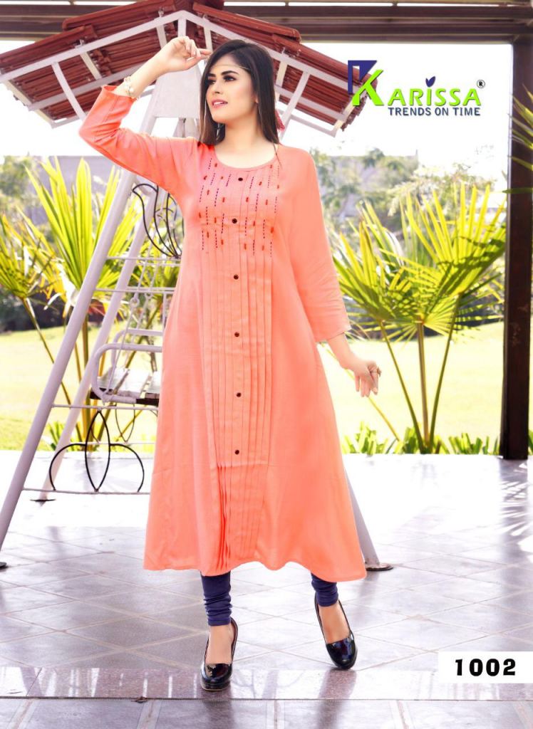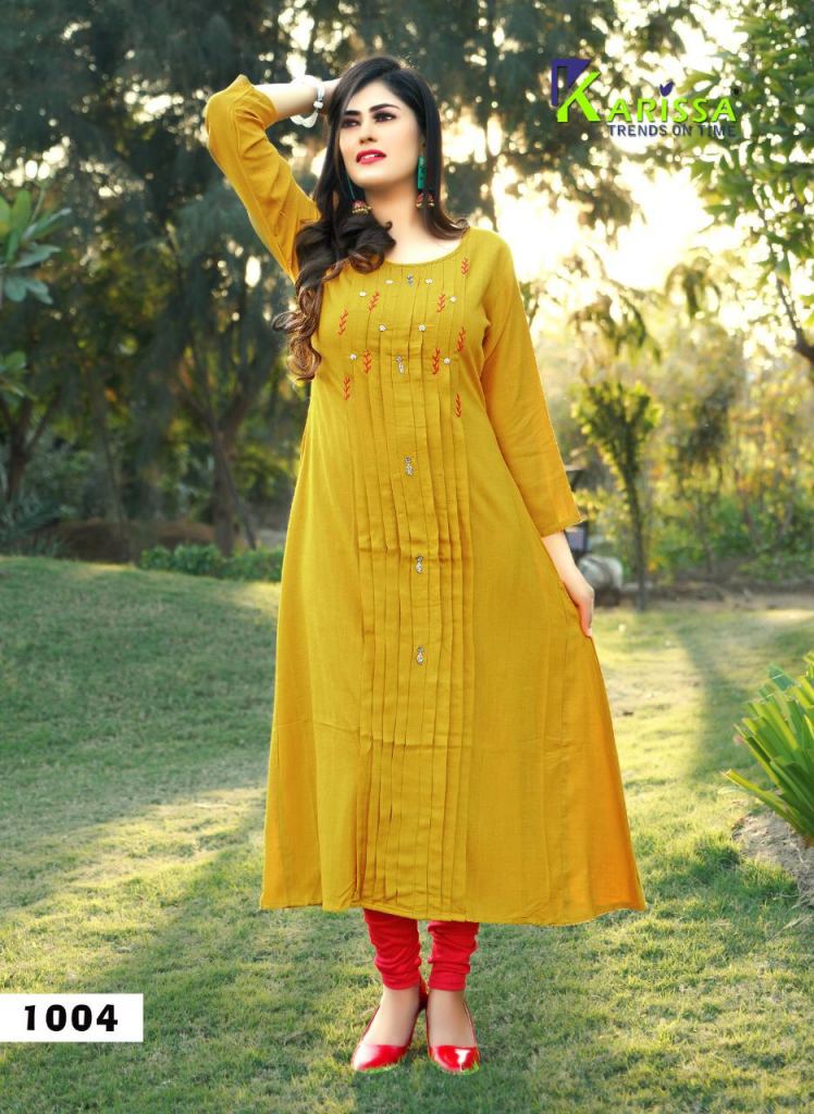 Karissa Present Muskan vol 3 Kurtis Catalogue. This index is in the texture Heavy rayon slub. this assortment is a sum of different Four various Designs and shading. this list all are distinctive shading and designs too. this catalog is Kurtis's very fine Embroidery designs and color all are fashionable with suitable and Embroidery work in neck part.