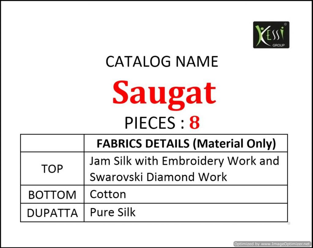 Kessi Present Saugat Designer Dress Material collection. This index is in the texture of the jam silk. this assortment is a sum of different Eight various Designs and shading. this list all are distinctive shading and designs too. this collection is dress material top jam silk with Embroidery work and Swarovski diamond work. the bottom is cotton with dupatta is pure silk.