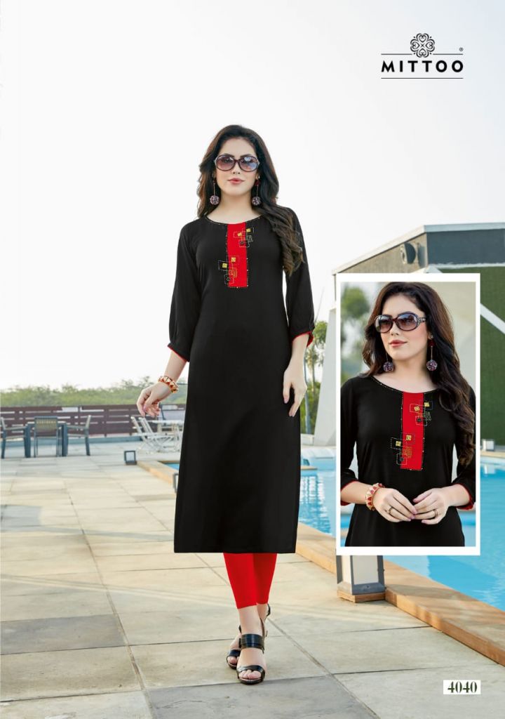Mittoo present Button casual wear Kurtis Catalogue. This index is in the texture of Heavy Rayon. this assortment is a sum of different Eight various Designs and shading. this list all are distinctive shading and designs too. this catalog is Kurtis's fine fabric with little designs in the neck part that are various types of designs.