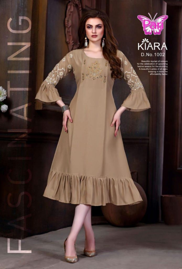 Pari Kiara collection of heavy muslin designer kurti with self embroidery work and lowe edges frill design in different designs and colours. This catalogue is available at wholesale rate.