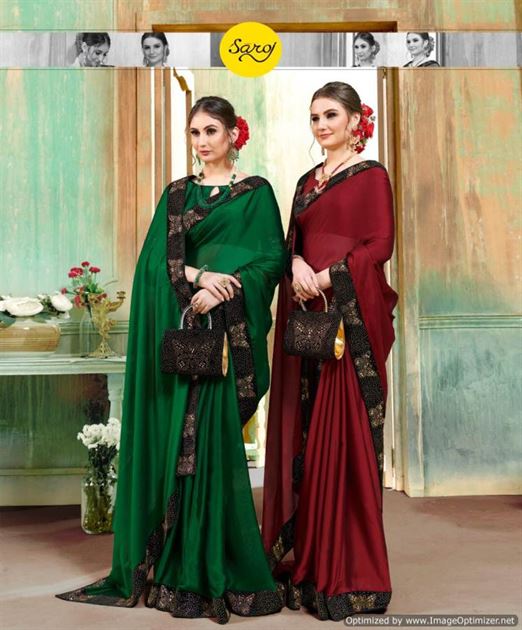 Saroj By Sapphire party wear Heavy Saree Collection. sarees are fabric in Black Rangoli Silk. sarees are in side plain no designs and border line lace like border that border line are Black Rangoli with swarovski border.