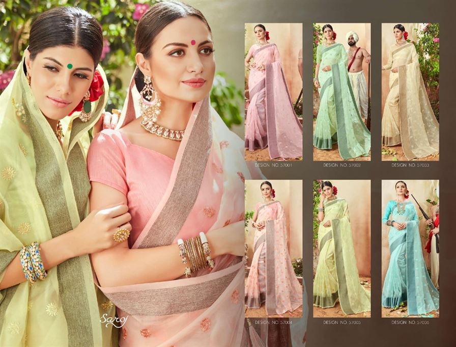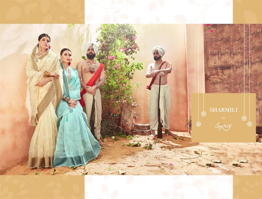 Saroj presents Sharmili party wear sarees catalog. this catalogue is the texture in Organza. this assortment is all out six various structures and hues. this collection is structured like a portion of the print and a portion of the normal example. this catalog are sarees all are light in color with Organza with the town to town Embroidery work, and blouse is silk.