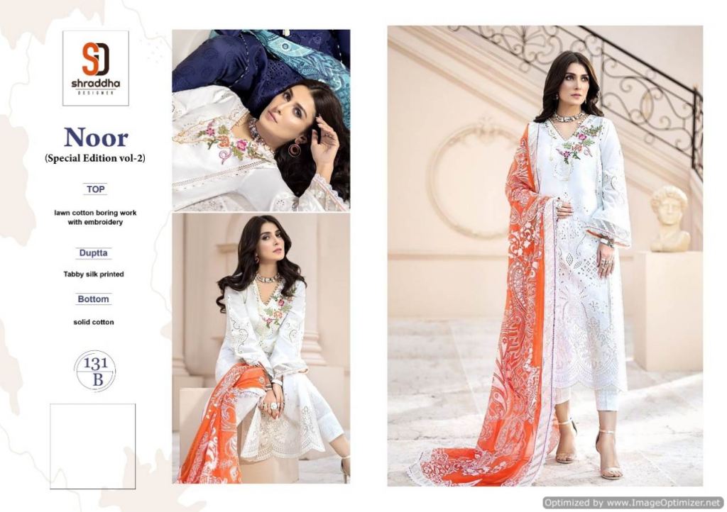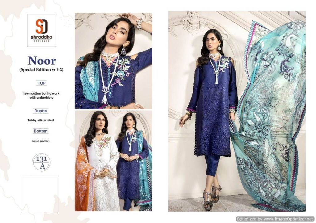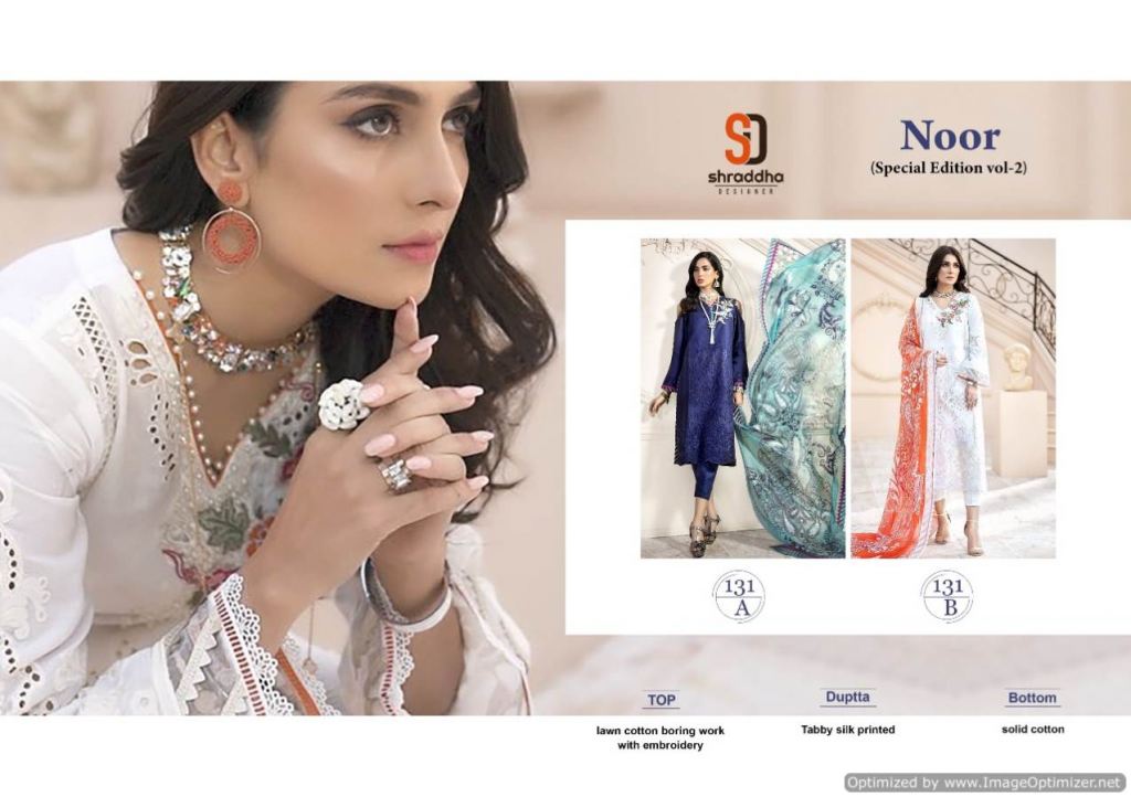 Shraddha Present Noor Special Edition vol 2 Pakistani Suits collection, This index is in the texture of. this assortment is a sum of different two various Designs and shading. this list all are distinctive shading and designs too. this catalog is top Lawn cotton boring work with Embroidery, the bottom is Solid cotton, with dupatta, is Tabby silk printed.