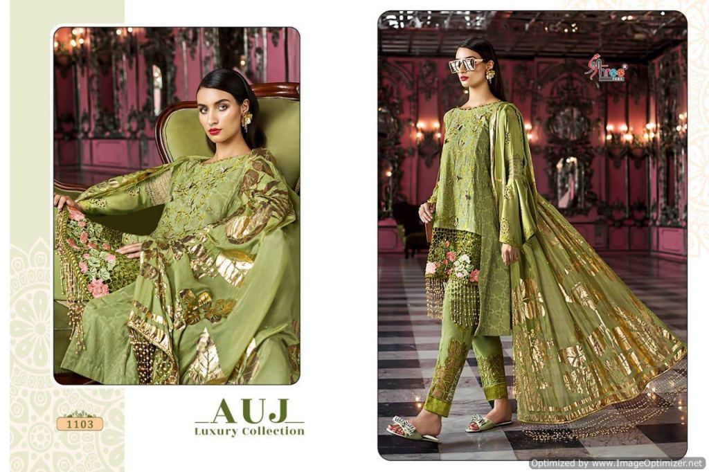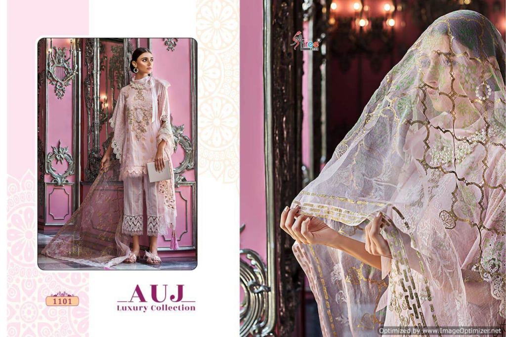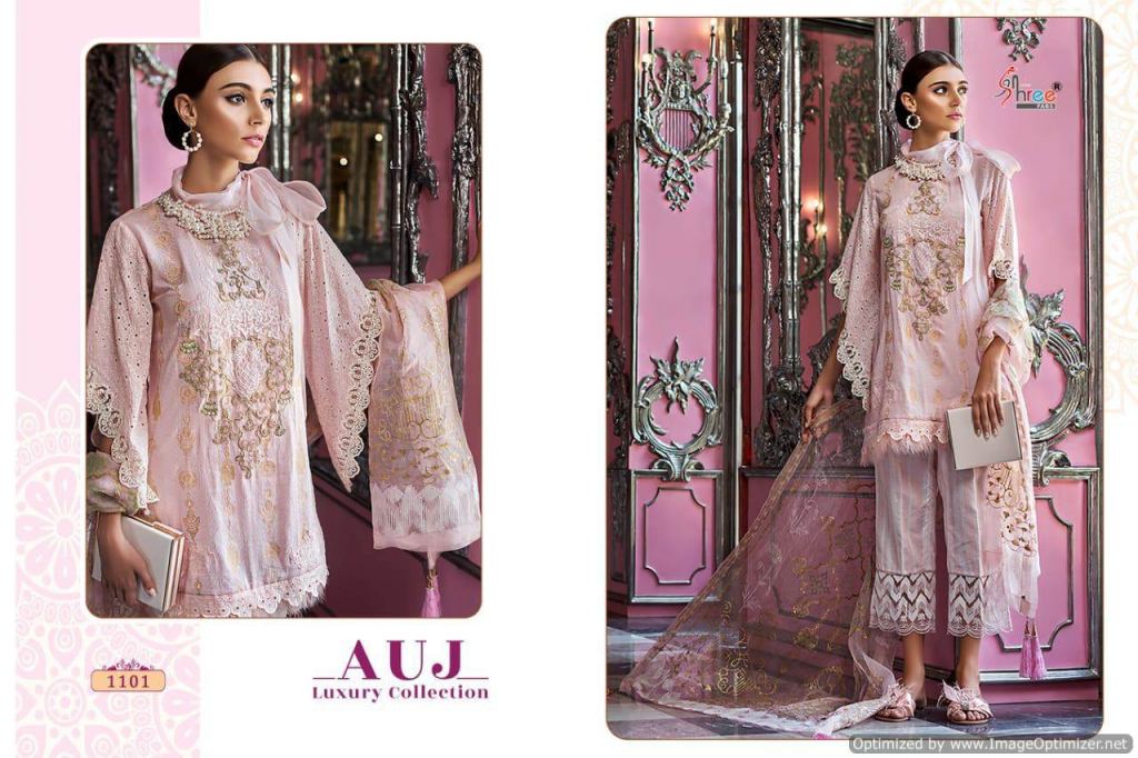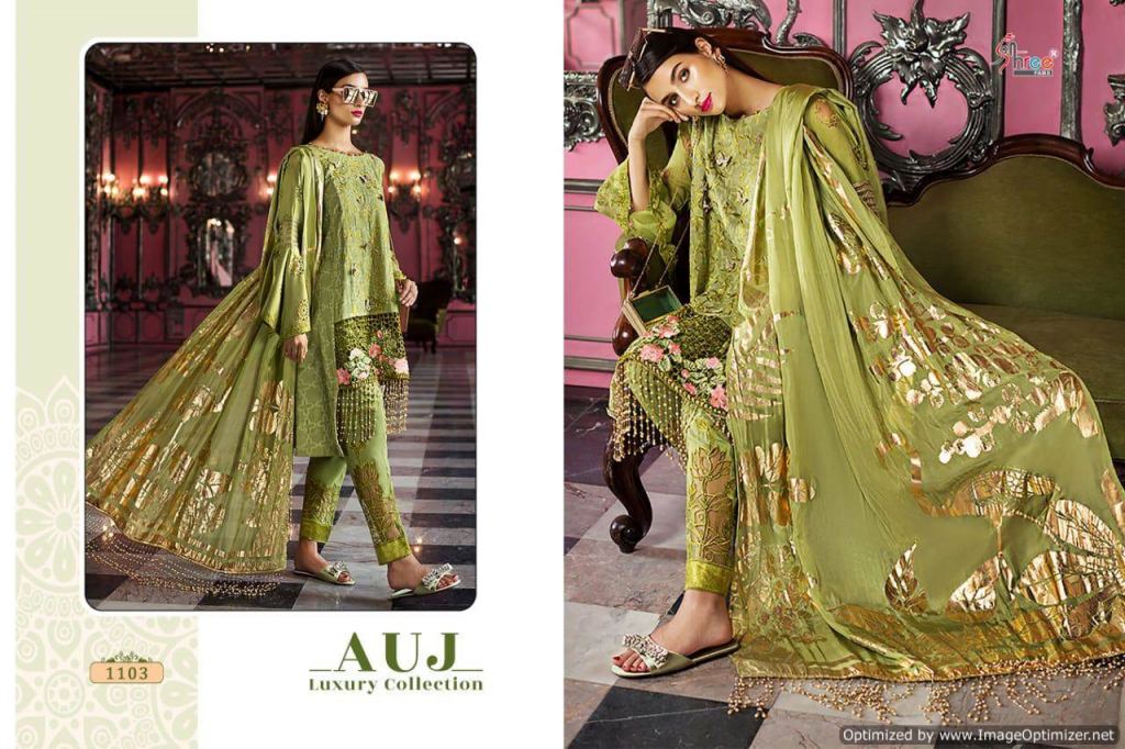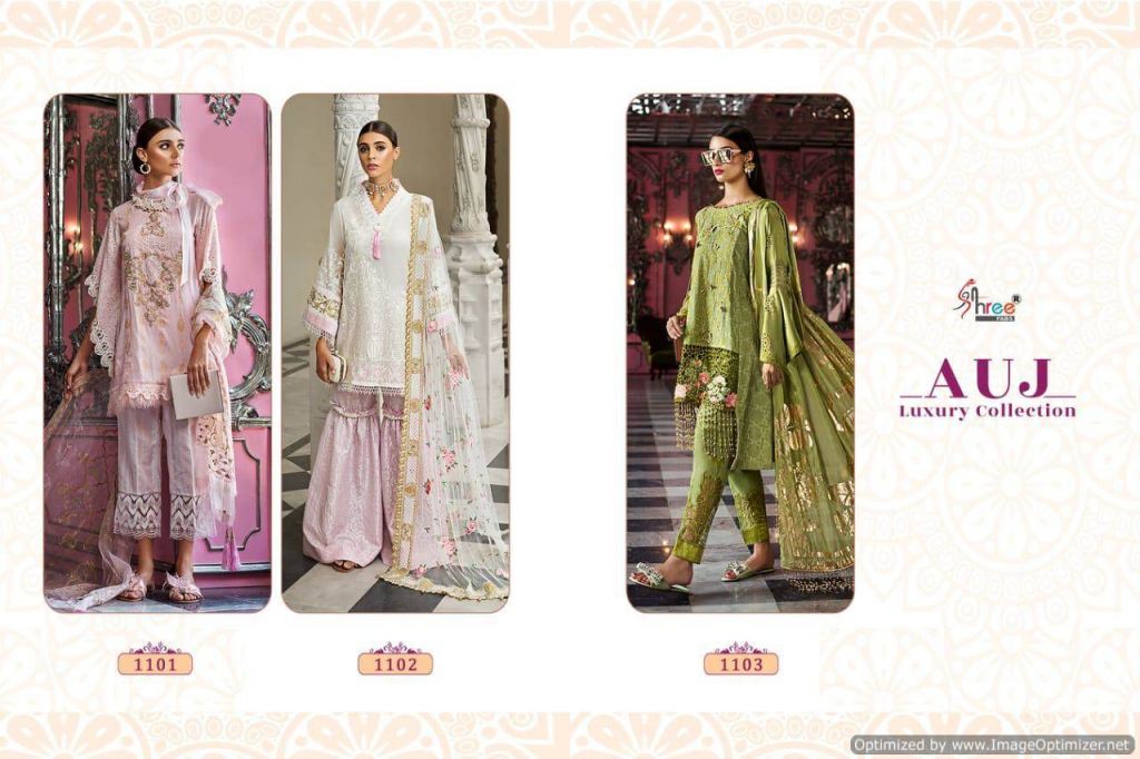 Shree Auj Luxury collection of pure cotton pakistani suit with different lawn print and embroidered design in different colours.