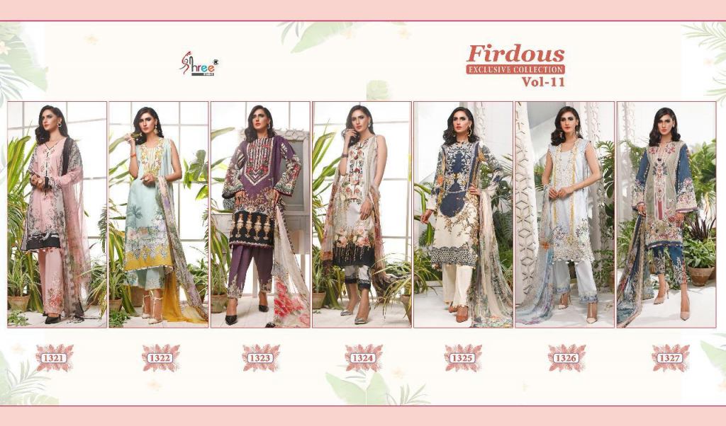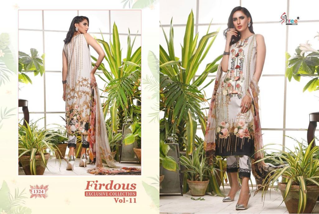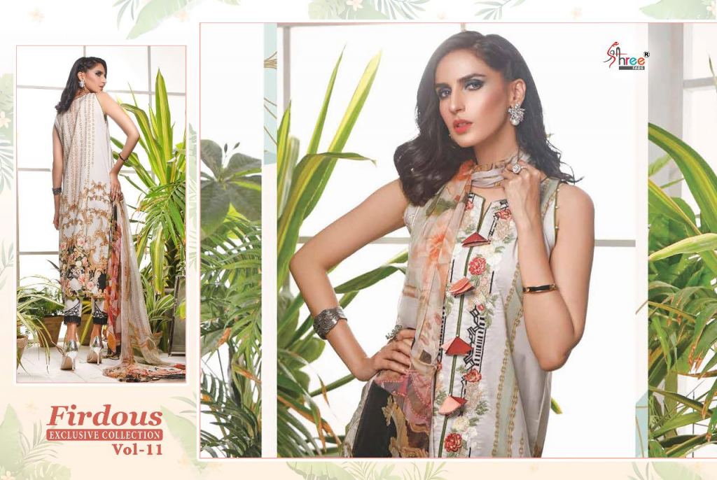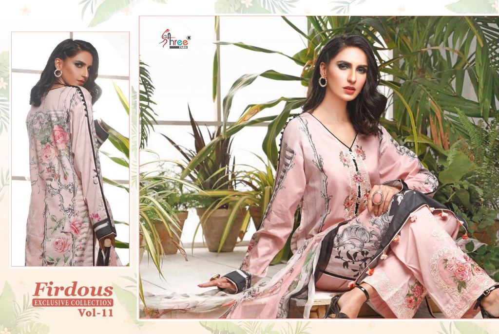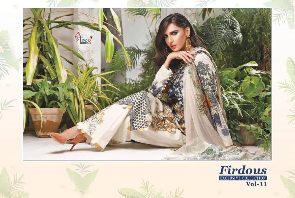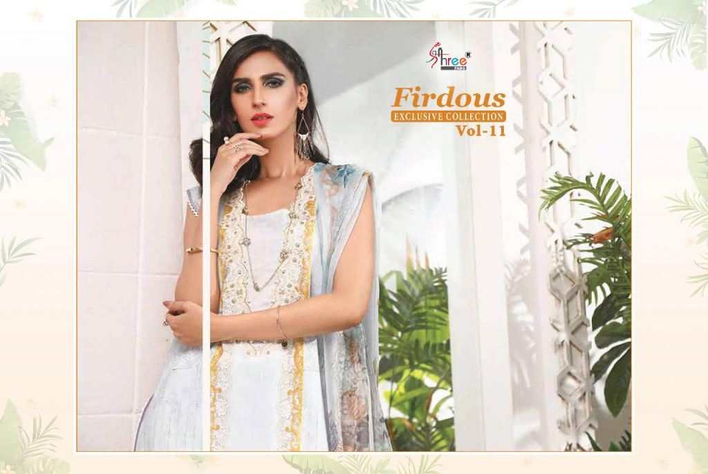 Shree Firdous exclusive collection 11 of jam cotton pakistani suit with different digital print and embroidery work designs in different colours. heavy jam cotton top with digital print and embroidery work. semi lawn bottom and cotton mal-mal dupatta. This catalogue is available at wholesale rate.