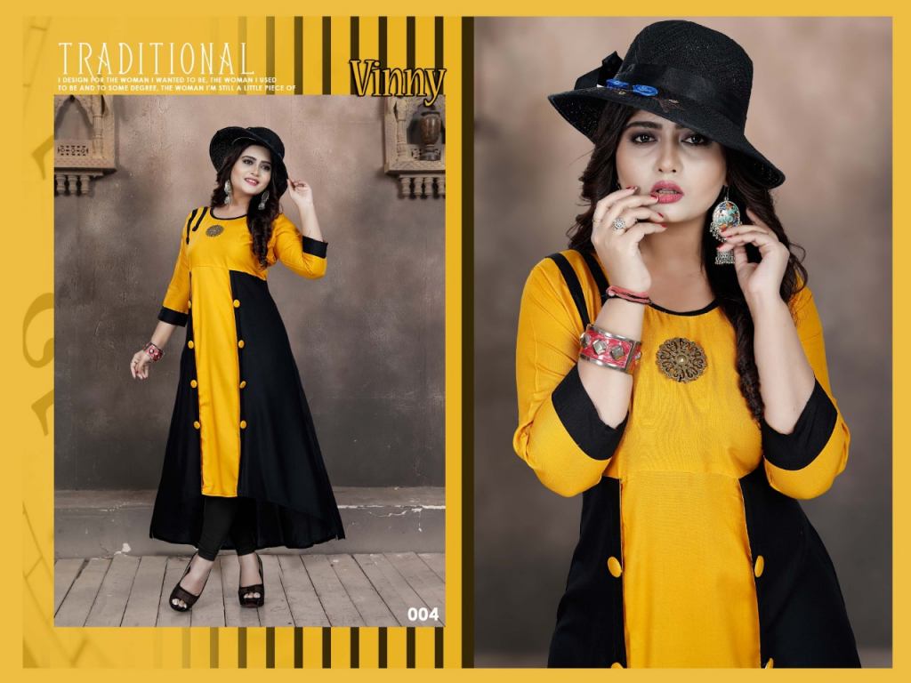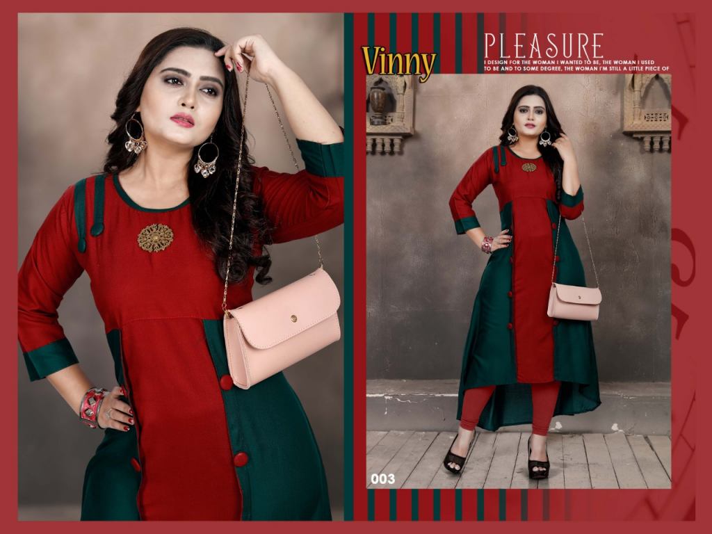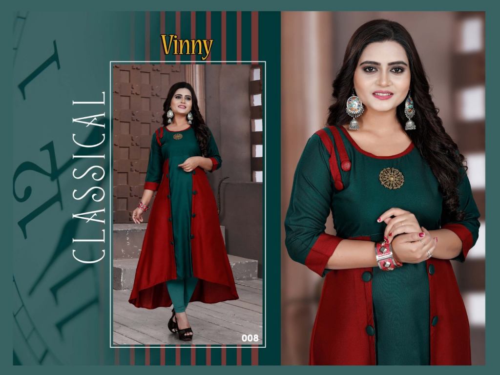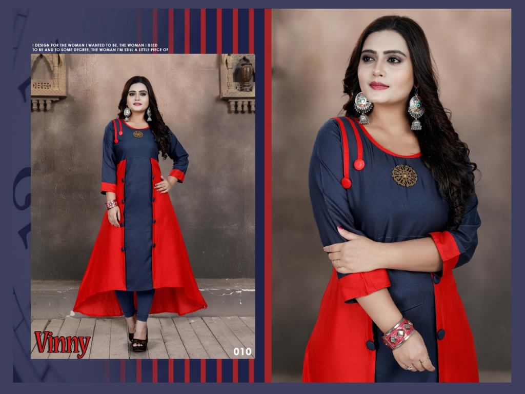 Vinny designer Kurtis Catalogue. This index is in the texture 14kg rayon. this assortment is a sum of different ten various Designs and shading. this list all are distinctive shading and designs too. this catalog is Kurtis long Anarkali types look. this catalog designs, the pattern will be the same but color different with more than two-color.