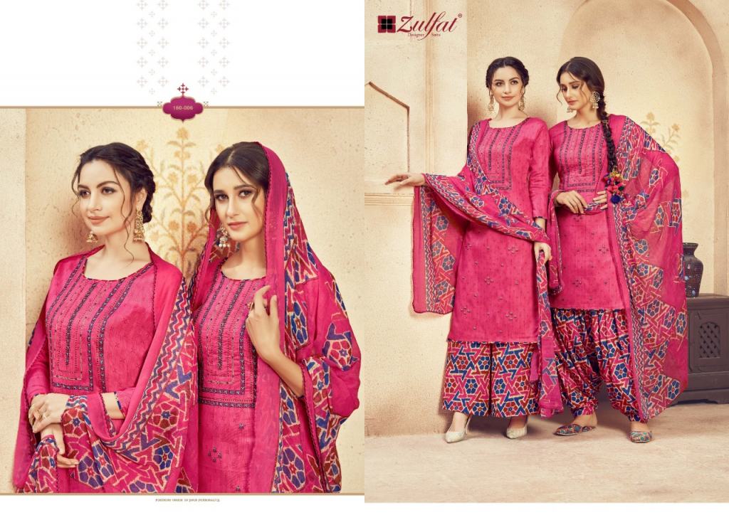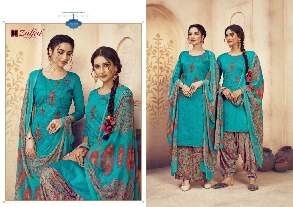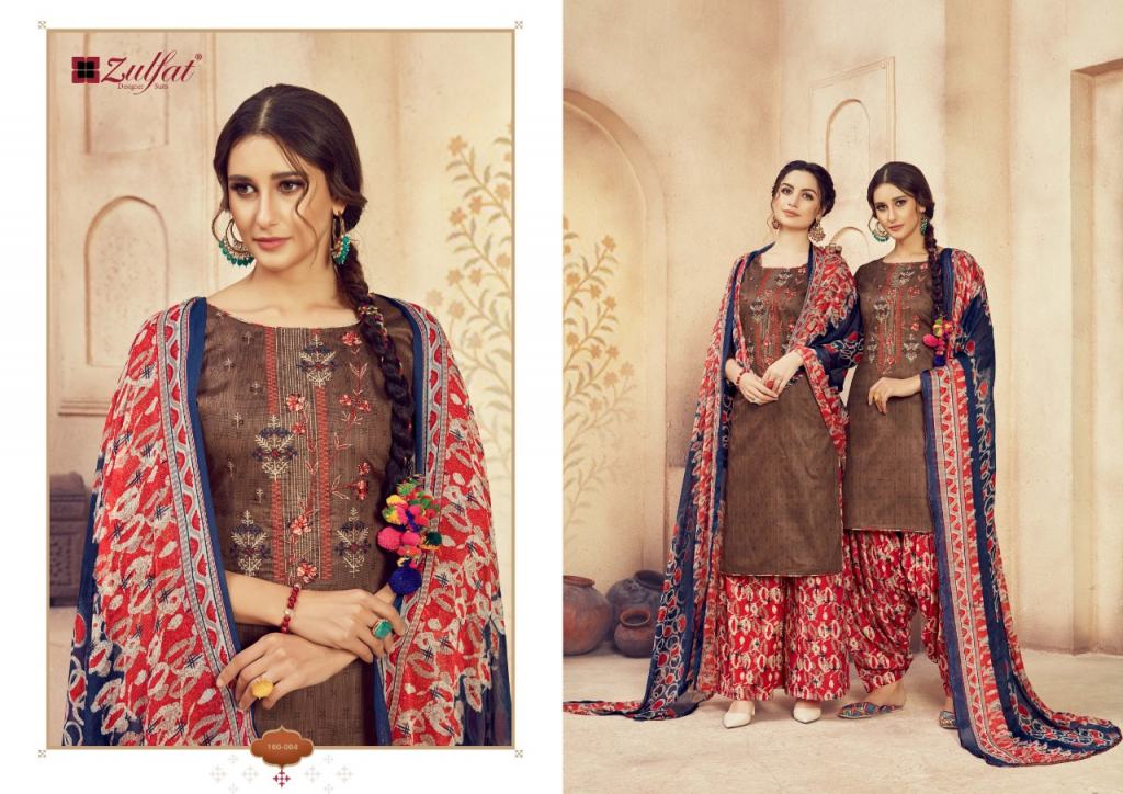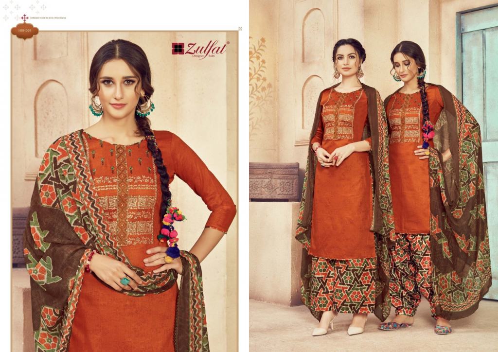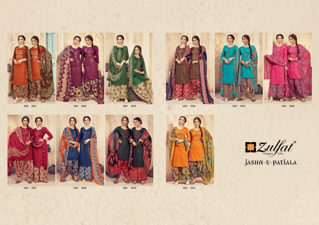 Zulfat Present Jashn e patiyala dress Catalogue. This index is in the texture of Pure heavy jam cotton. this assortment is a sum of different Ten various Designs and shading. this list all are distinctive shading and designs too. this catalogue is top 100% Pure heavy jam cotton print with heavy Embroidery, bottom are Pure soft cotton printed salwar, with dupatta is Pure nazneen dupatta with four side lace.