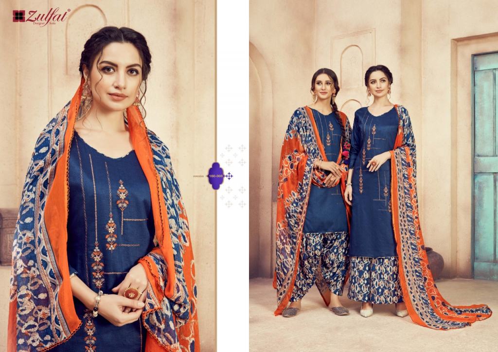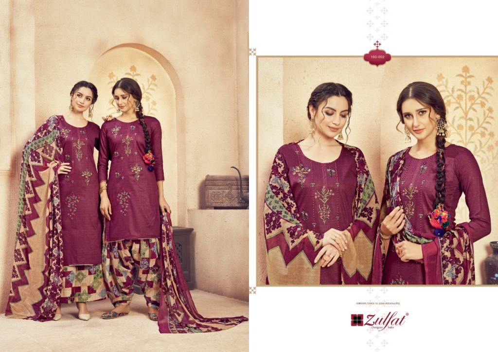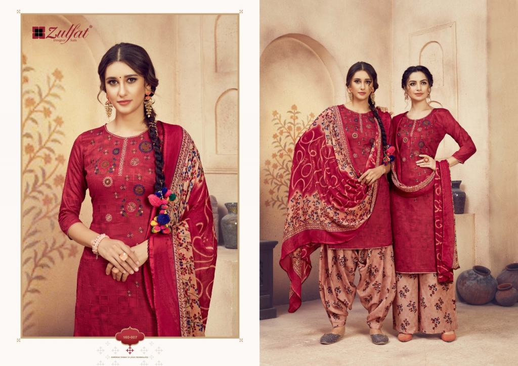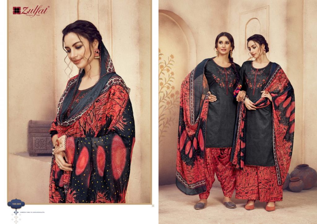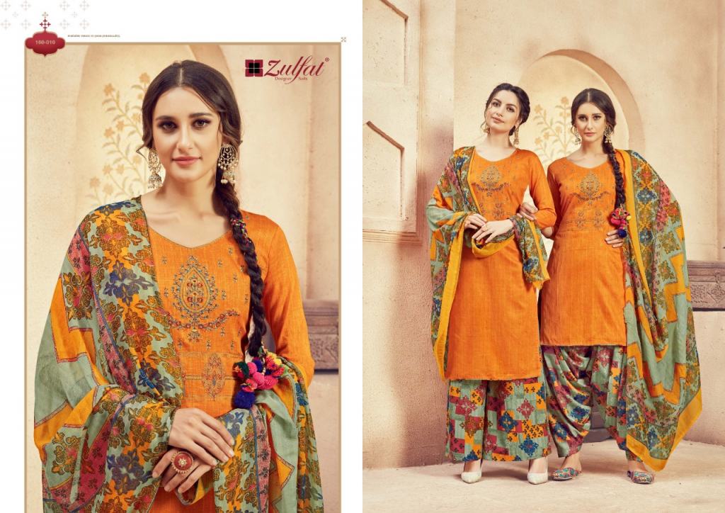 Zulfat Present Jashn e patiyala dress Catalogue. This index is in the texture of Pure heavy jam cotton. this assortment is a sum of different Ten various Designs and shading. this list all are distinctive shading and designs too. this catalogue is top 100% Pure heavy jam cotton print with heavy Embroidery, bottom are Pure soft cotton printed salwar, with dupatta is Pure nazneen dupatta with four side lace.